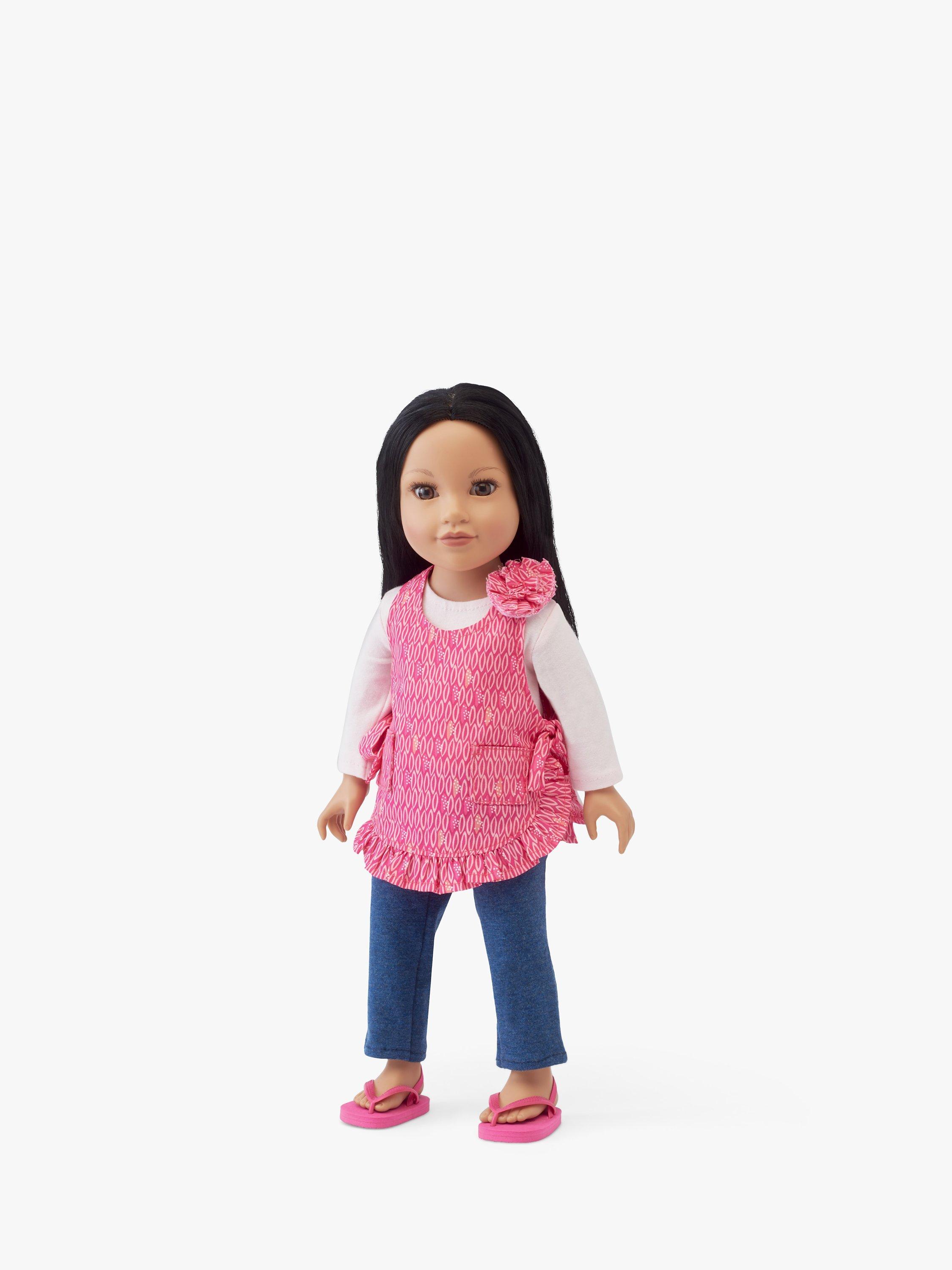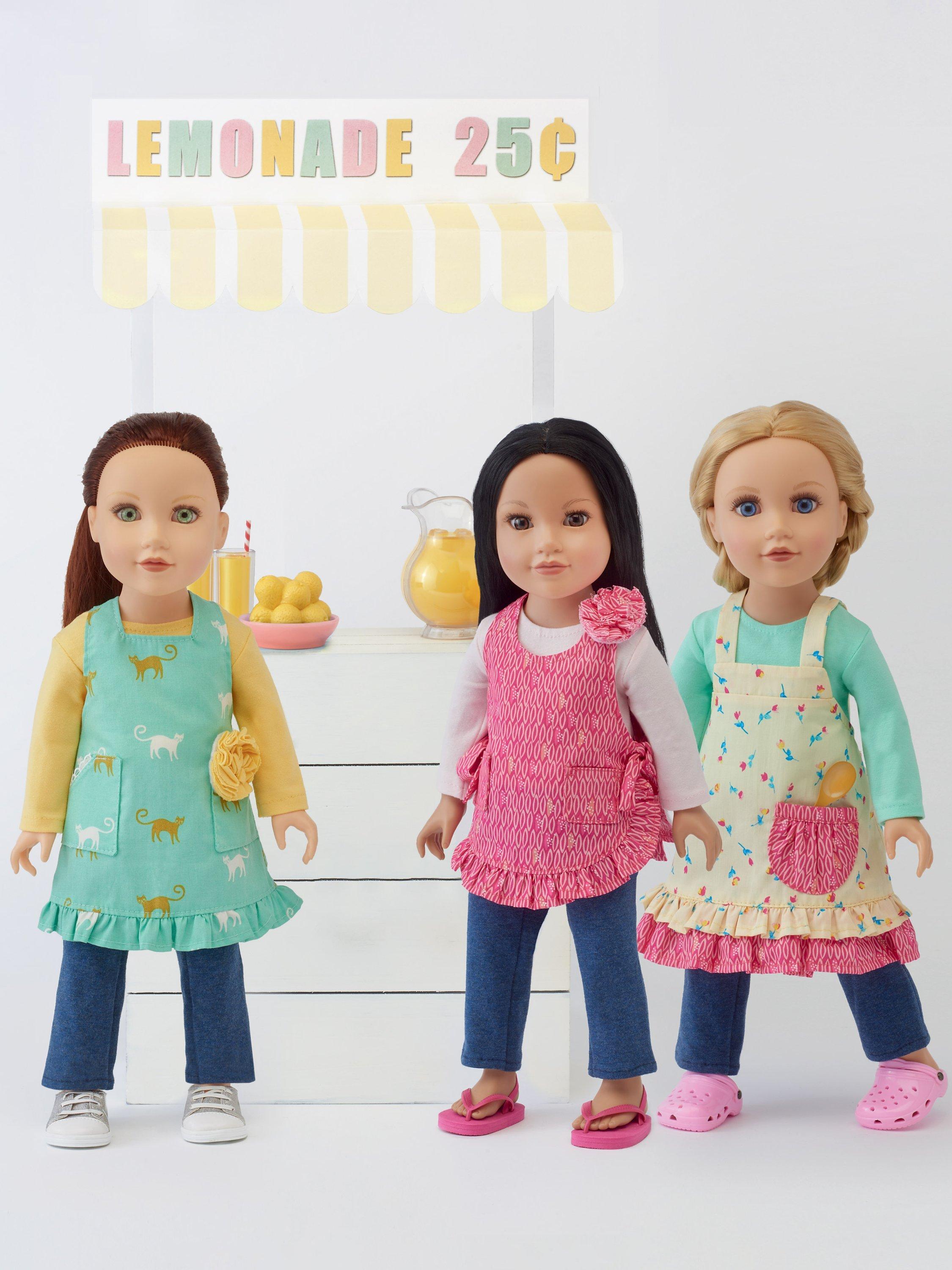 Time to get cooking - cottage chic sweet aprons with ruffled and fabric flower accents, sized for 46cm dolls. Pattern includes knit top and legging basics to wear underneath.