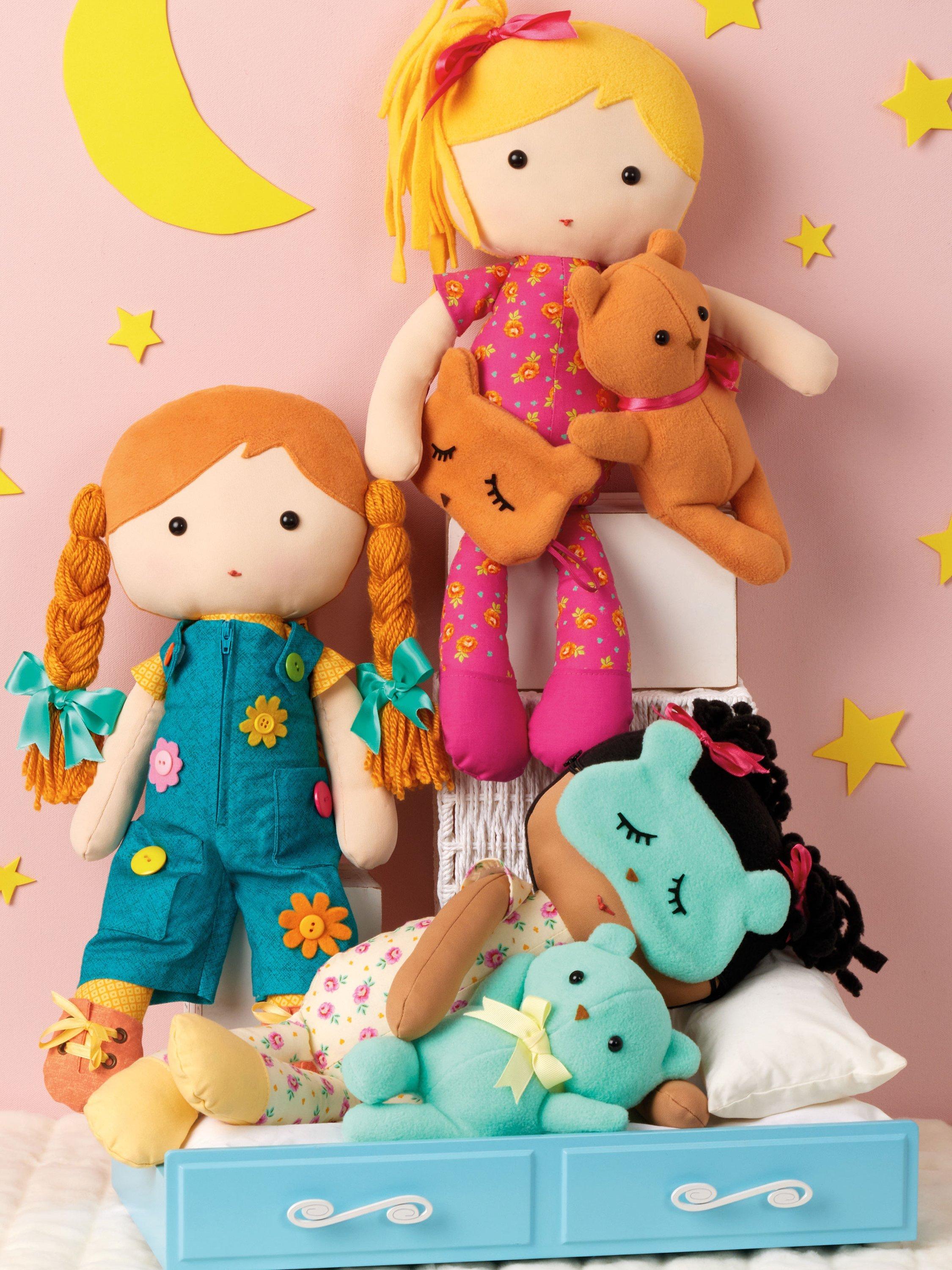 Adorable 46cm plush dolls with built-in basic clothes and shoes have fleece or yarn hair styles, safety eyes and embroidered mouths.