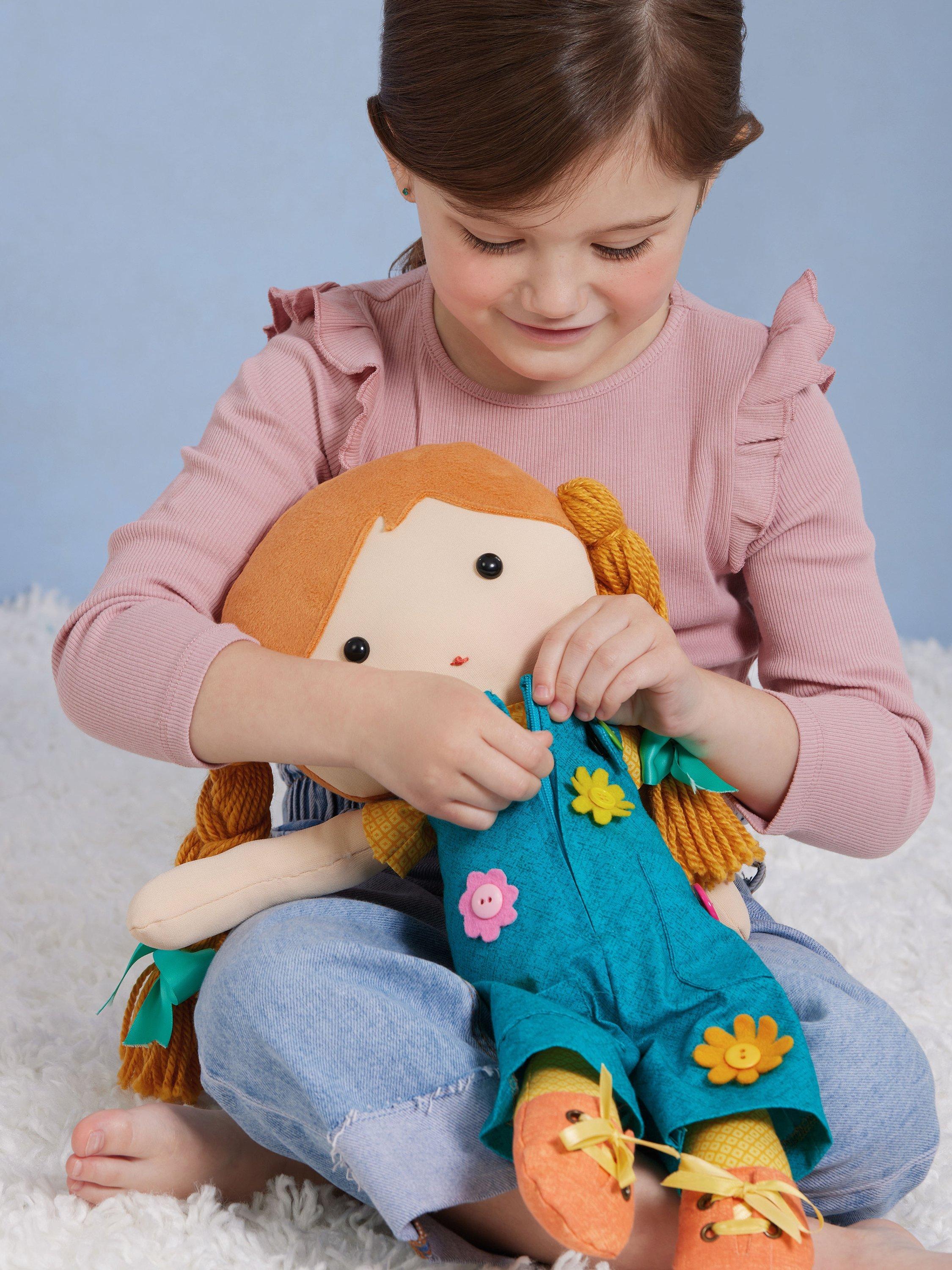 Views A and B are sleepy time dolls with sleep mask and teddy accessories. View C dress-me doll has overalls designed for children to practice using zips, buttons, snaps and tying shoes for motor skill development.
