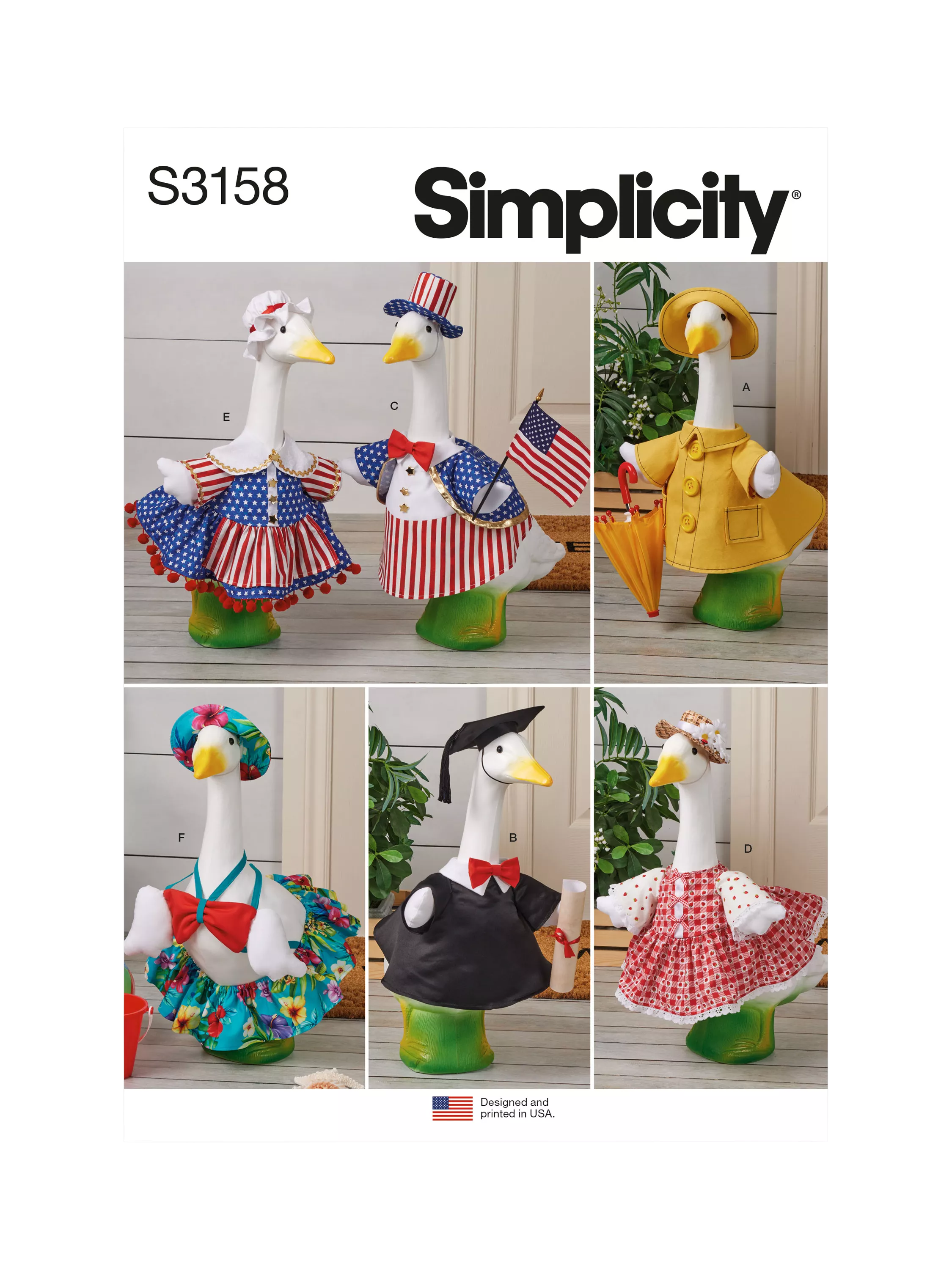 Fun summer outfits for 59cm porch geese include raincoat and hat, graduate, patriotic characters, summer dress and hat and bikini. All clothes slide easily over goose heads.