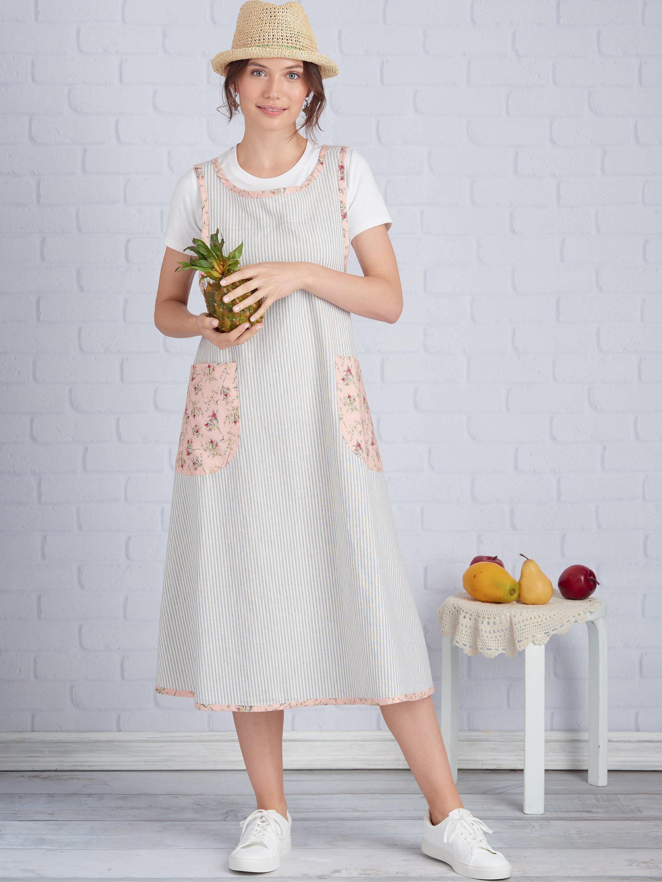 Wraparound aprons, in two lengths, that are are easy to sew and pretty to wear. Play with fabrics to make the most of the binding, ruffle and pocket details. Right at home in the kitchen or garden.