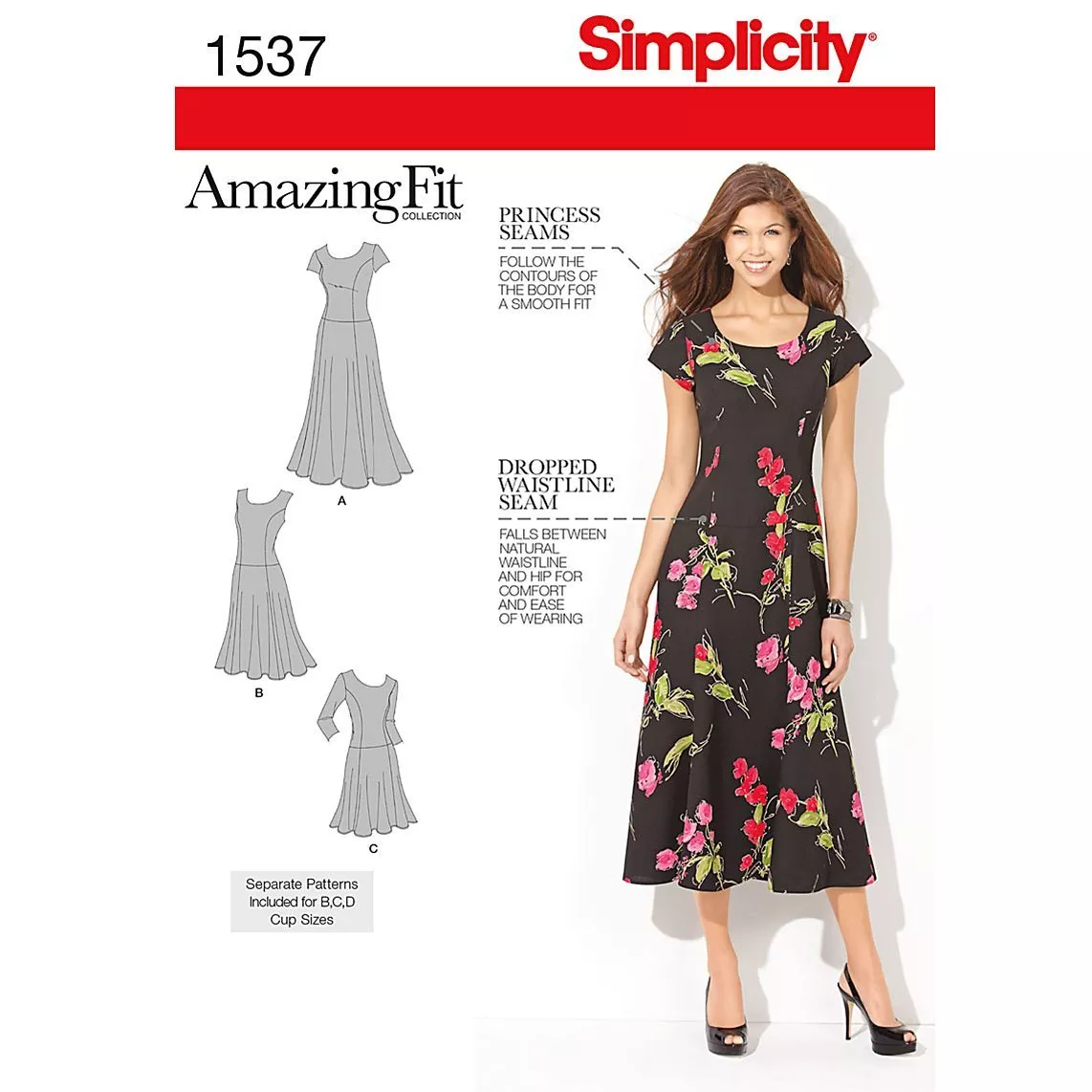 Amazing Fit Collection by Simplicity sewing pattern for Misses' and plus size dress in three lengths & sleeve variations. Individual patterns included for slim, average & curvy fit and cup sizes B, C, D for Miss and C, D, DD for plus sizes. Sizes: 20W - 28W.