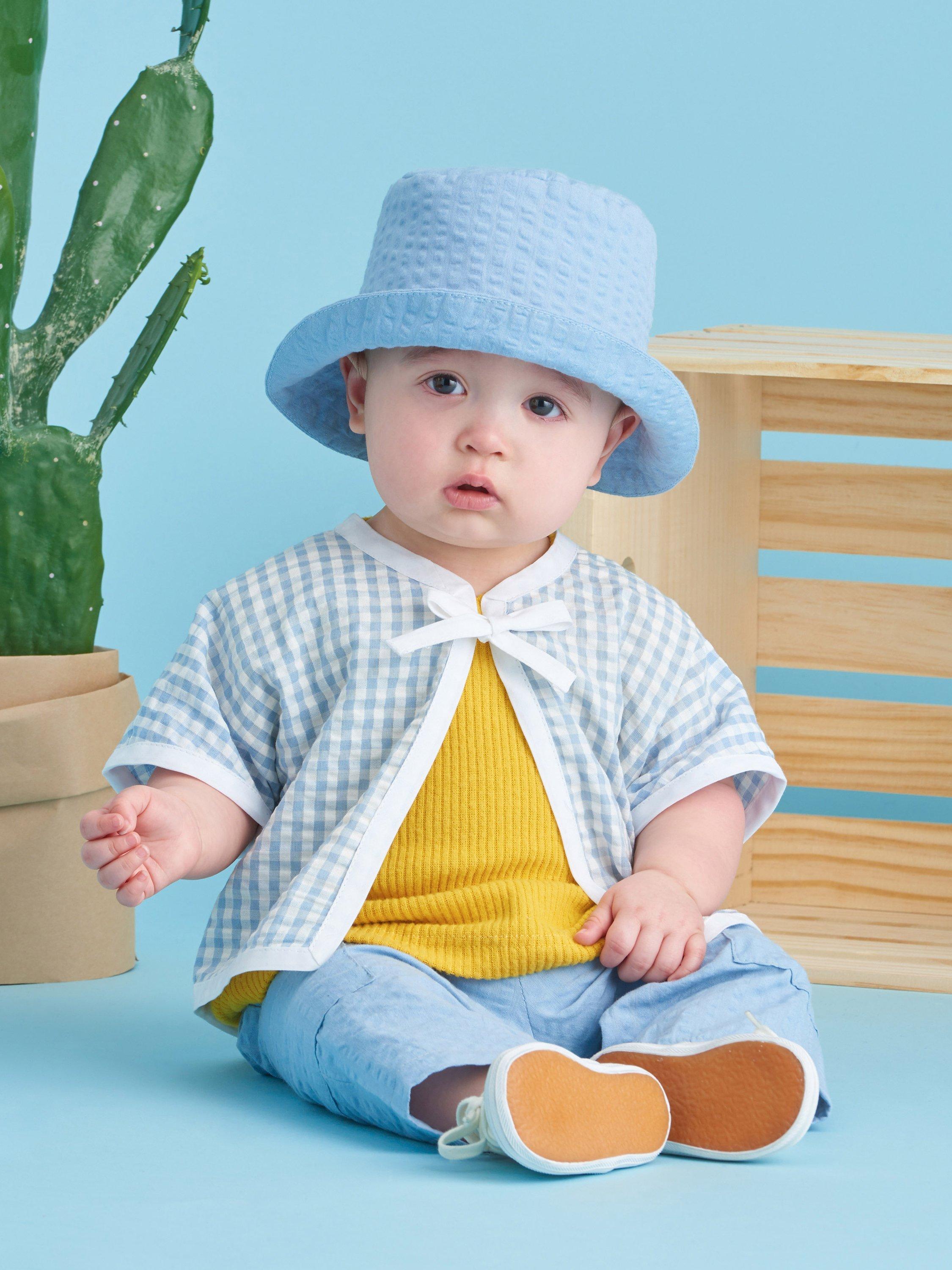 Pull-on pants have ruffle hem or cargo pockets. Bucket hat in three sizes S-M-L.