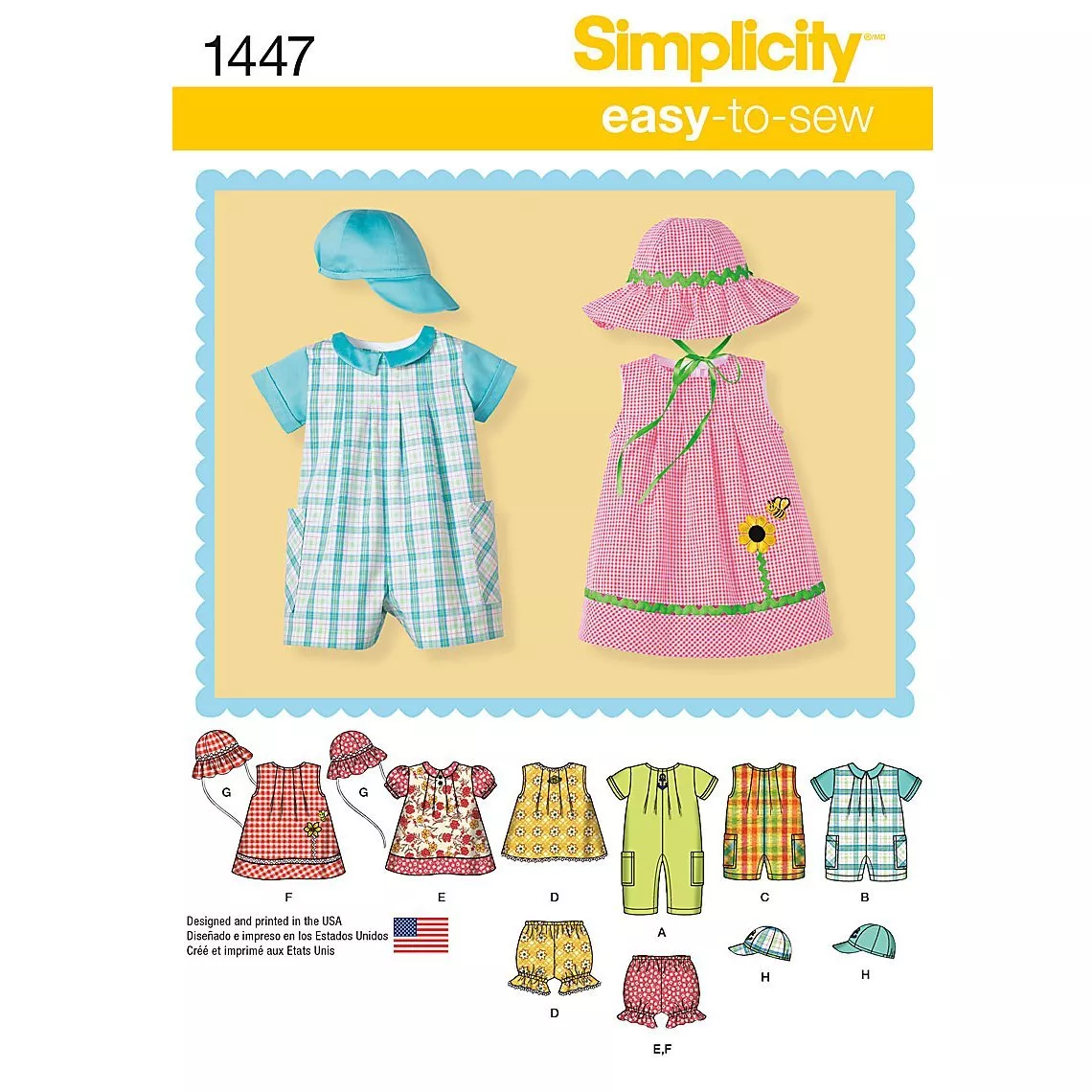 This Simplicity sewing pattern allows you to create babies' separates including a short & long romper with side pockets, a sleeveless dress with trim & applique, a short sleeved dress with collar and knickers. Sunhat and baseball cap both in three sizes S(17"), M(18"), L(19").