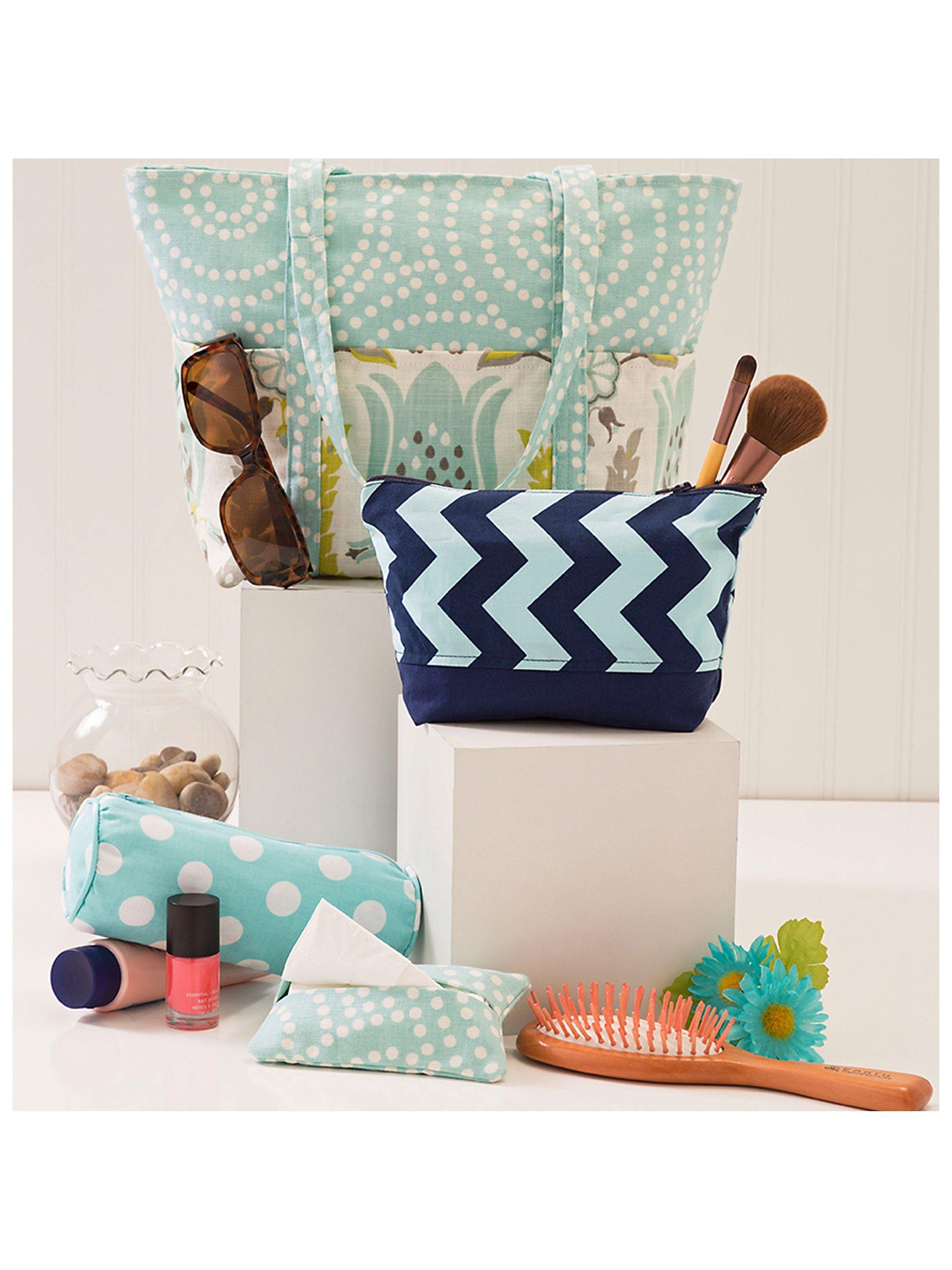 A bevy of bags to hold anything & everything! Totes A, B with outside pockets range in sizes from 8" x 10" to 9 1/2" x 12". Zippered cosmetic bags C - J range in sizes from 3" x 6" to 6" x 9". Tissue pack cover K measures 3" x 5".