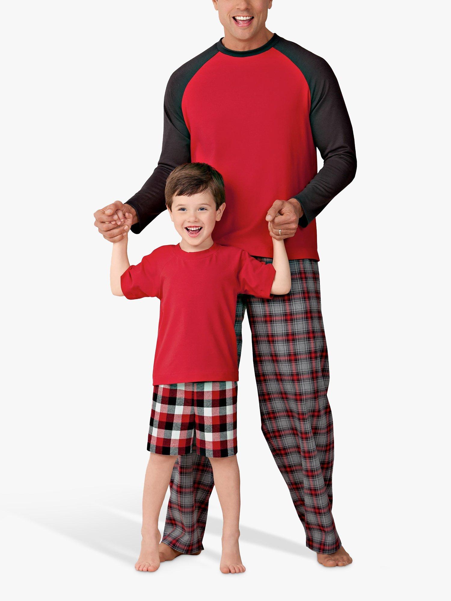 Boys' and Men's loungewear has pants or shorts with elastic waist, drawstring bag and knit baseball top with neckband and raglan sleeves.