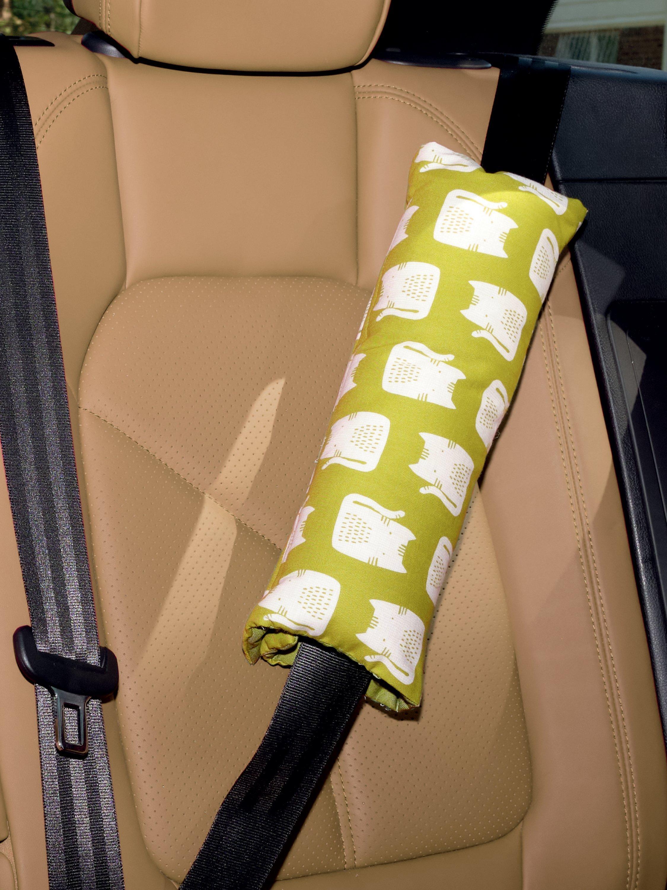 Also included are patterns for a comfy padded seat belt cover (14 x 35.5cm) and a headrest pillow (18 x 27cm).