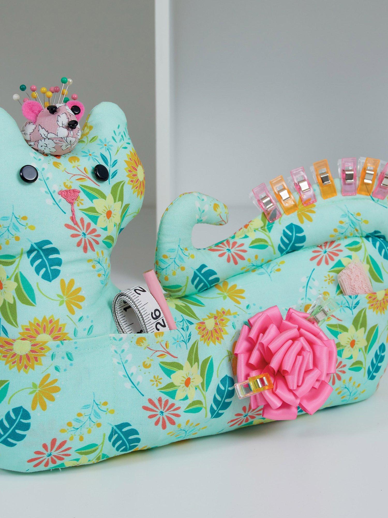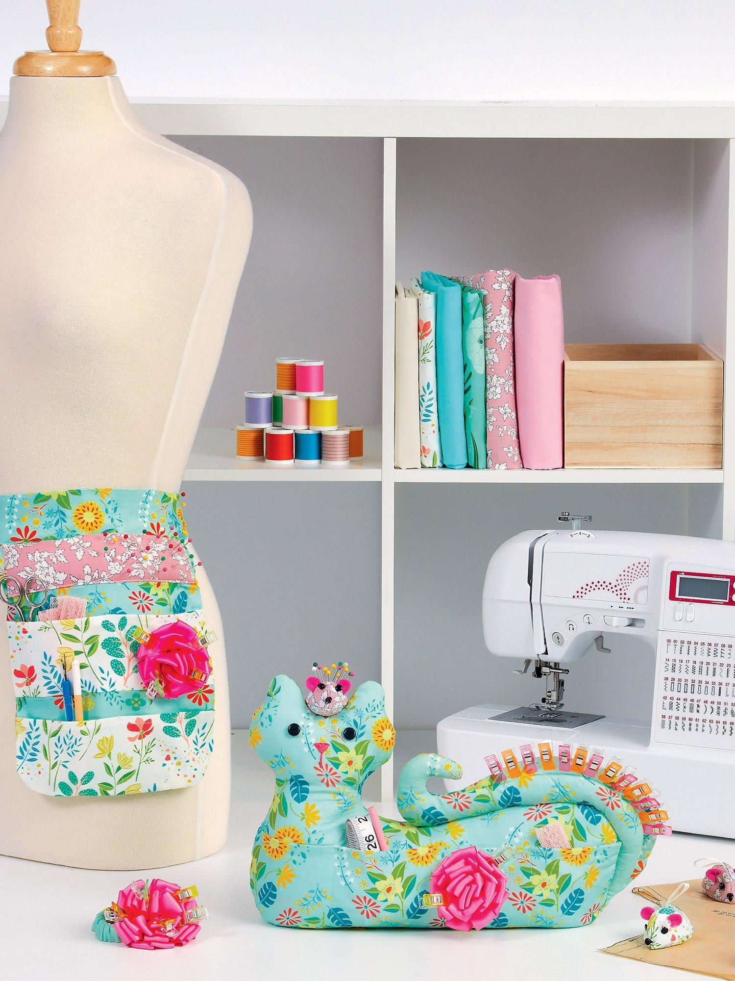 "Purrfect accessories" for your sewing space. A cat and mouse-themed sewing organizer (23cm x 36cm x 7.5cm), pincushion, sewing weights, apron and wristlet.