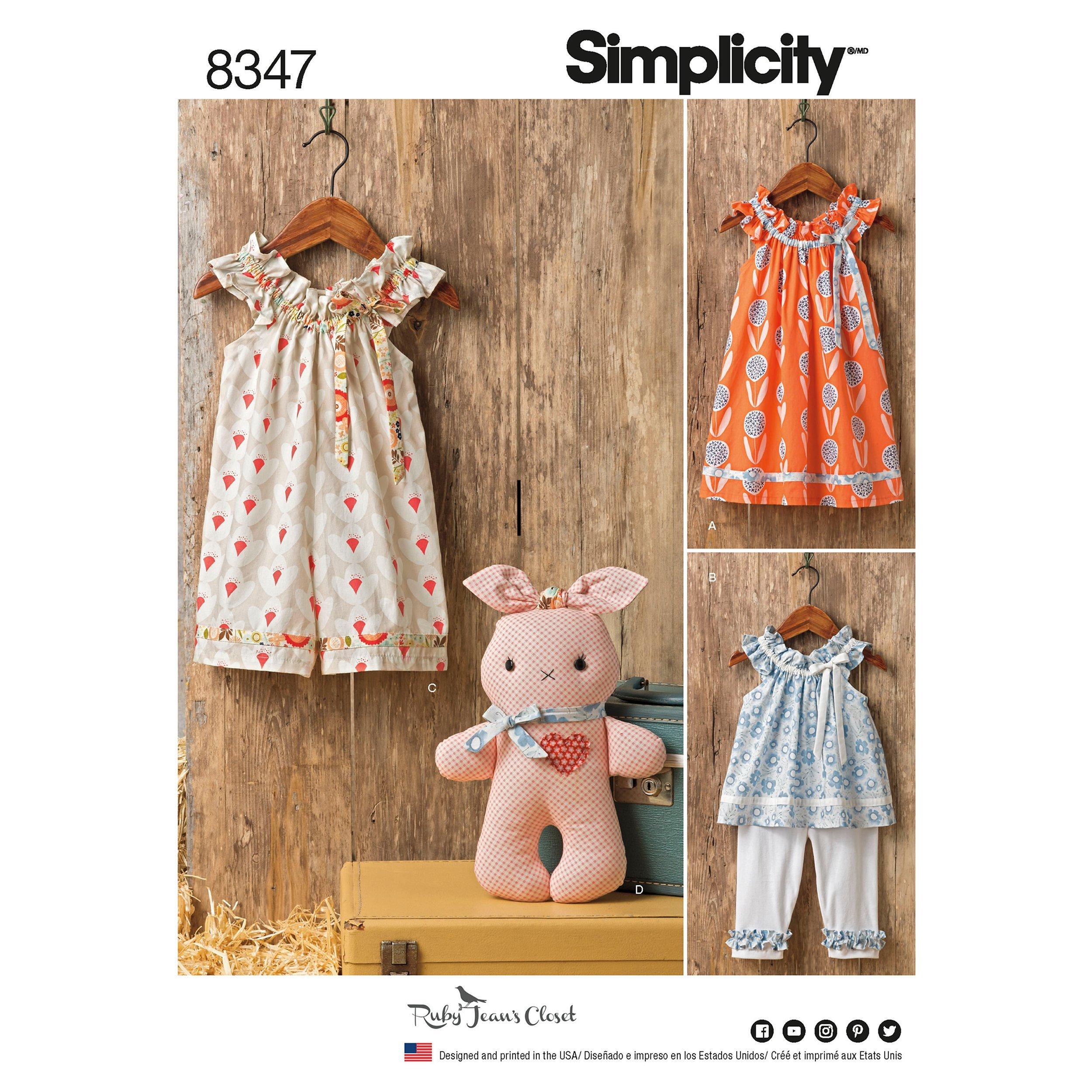 Featuring a dress, top, knit capris, romper and stuffed bunny, this Simplicity sewing pattern is perfect for kitting out your toddler in adorable fashion.