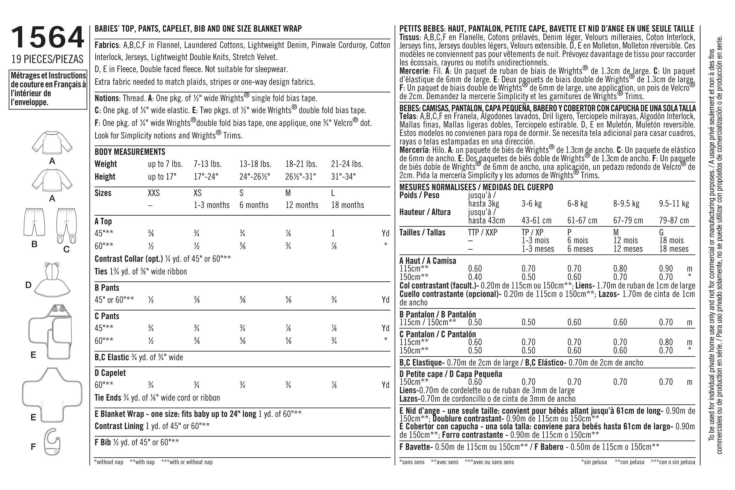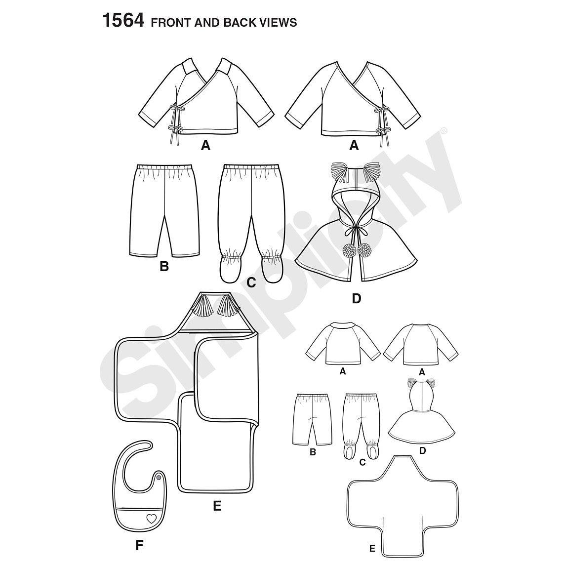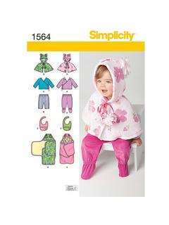 Simplicity sewing pattern for an adorable top for babies with pants that feature optional footies. Also included patterns for a caplet, bib and blanket perfect for swaddling. Sizes: XS (1-3 months), S (6 months), M (12 months), L (18 months).