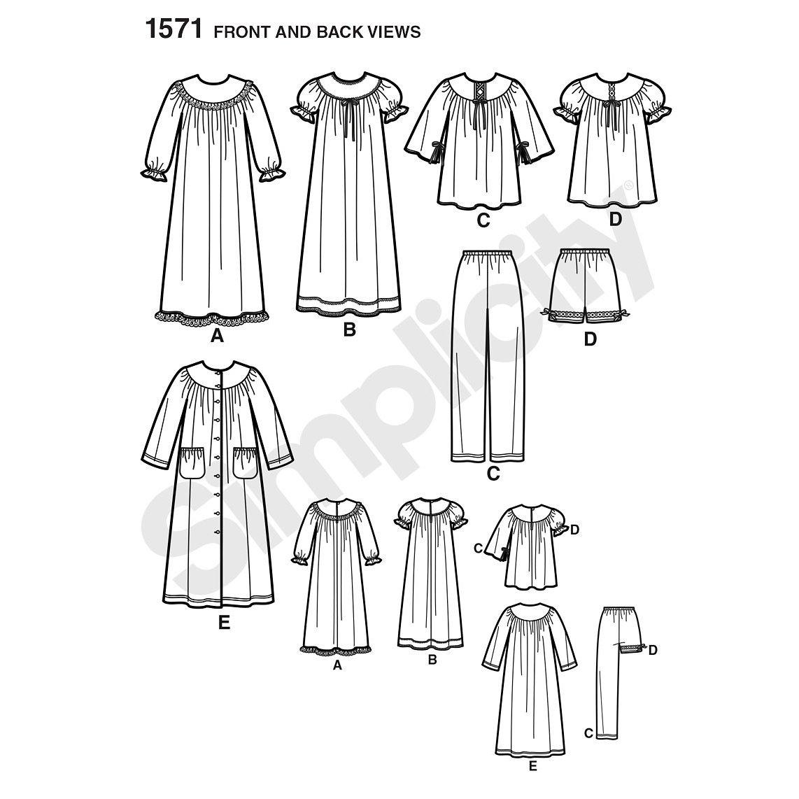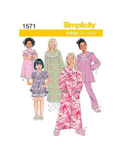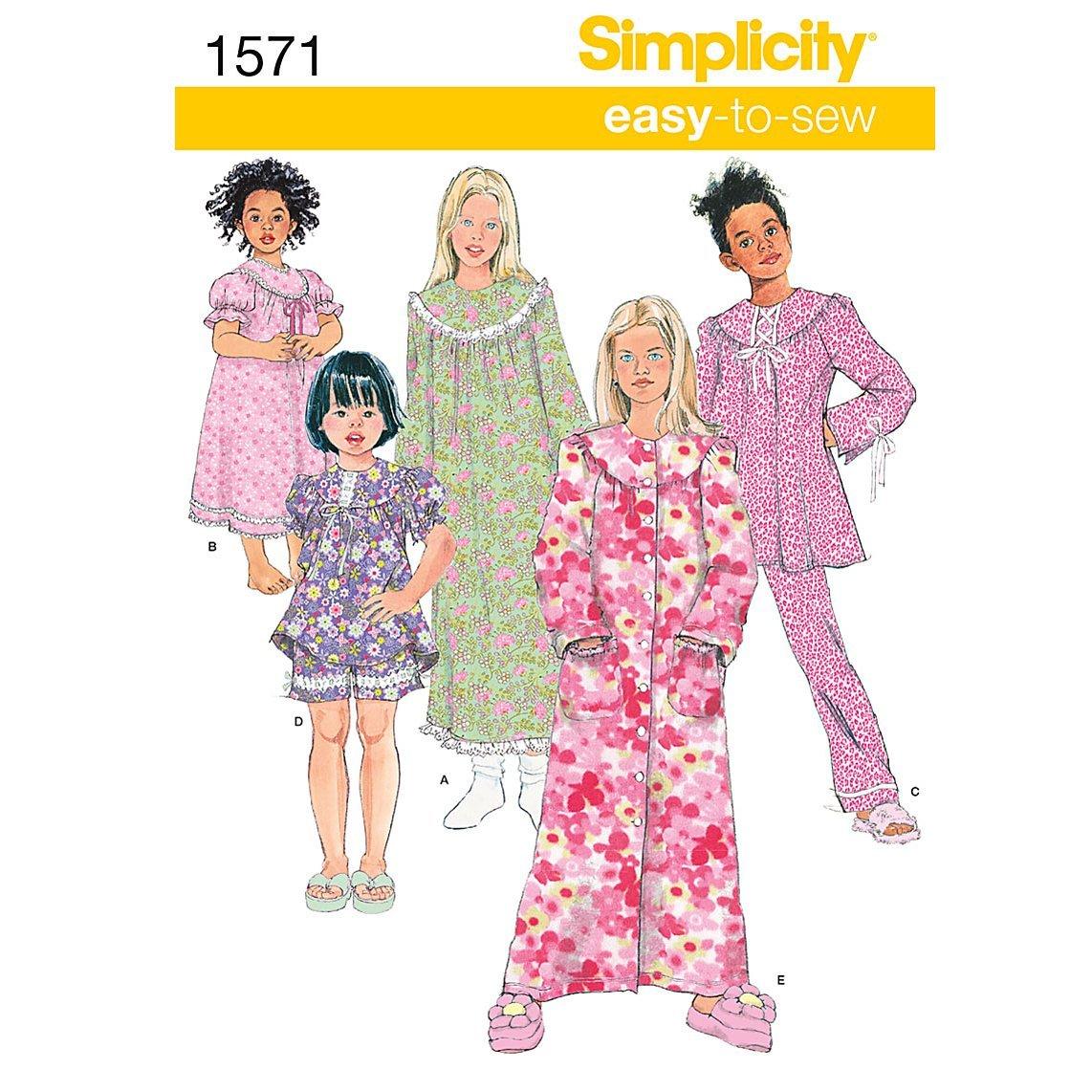 Simplicity sewing pattern for a children's and girl's nightgown, robe, and long or short pants. Sizes: 7-14 years.