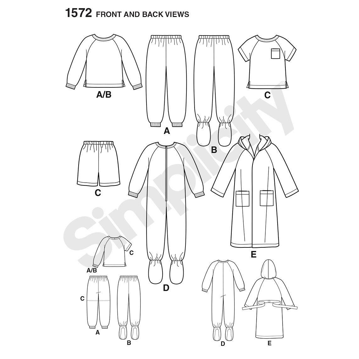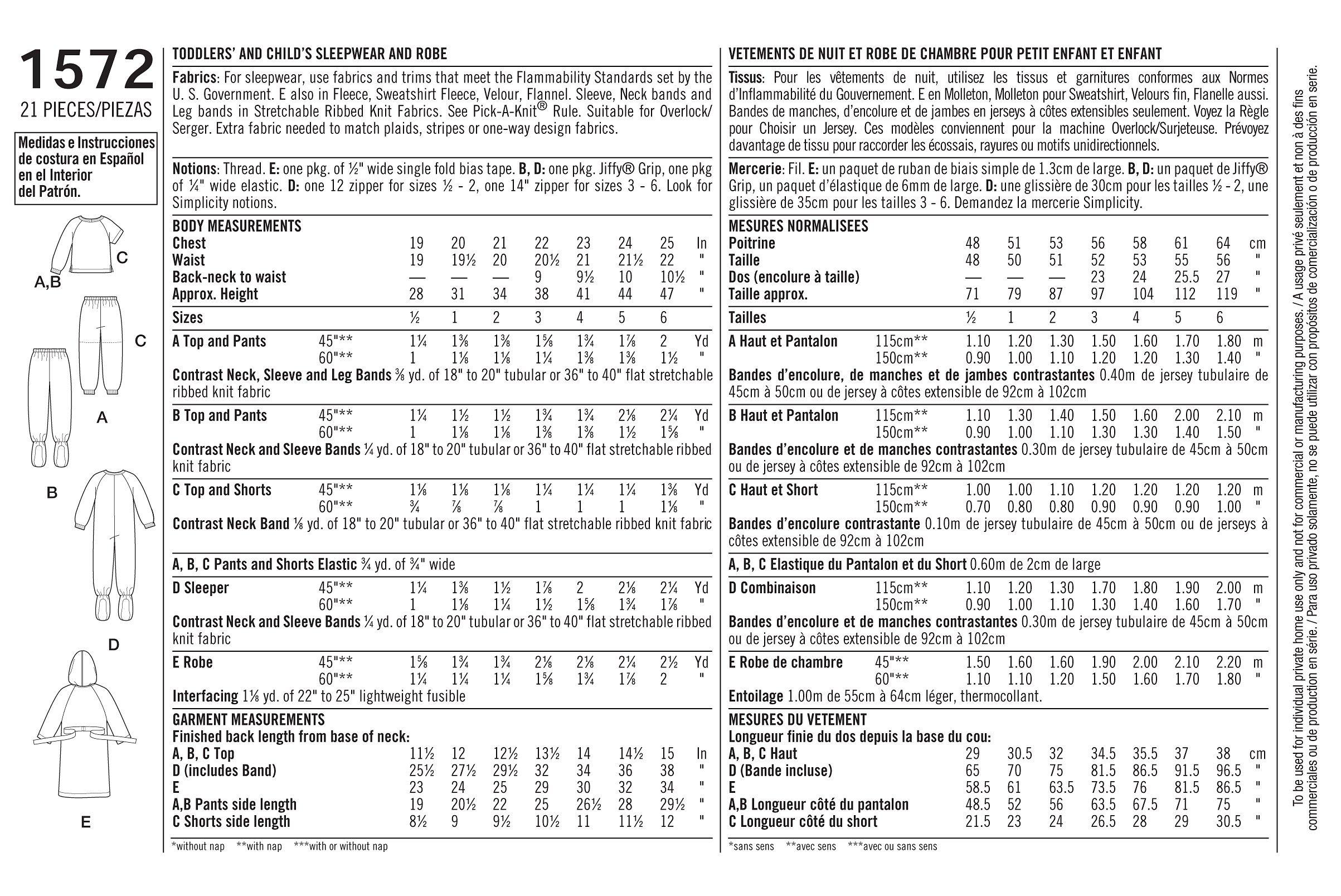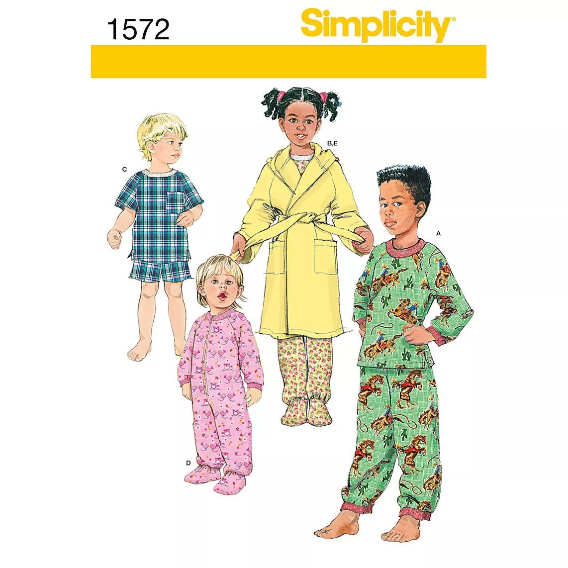 Simplicity sewing pattern for a toddlers' and child's sleep shirt, shorts or pants, robe, and footed onesie.
