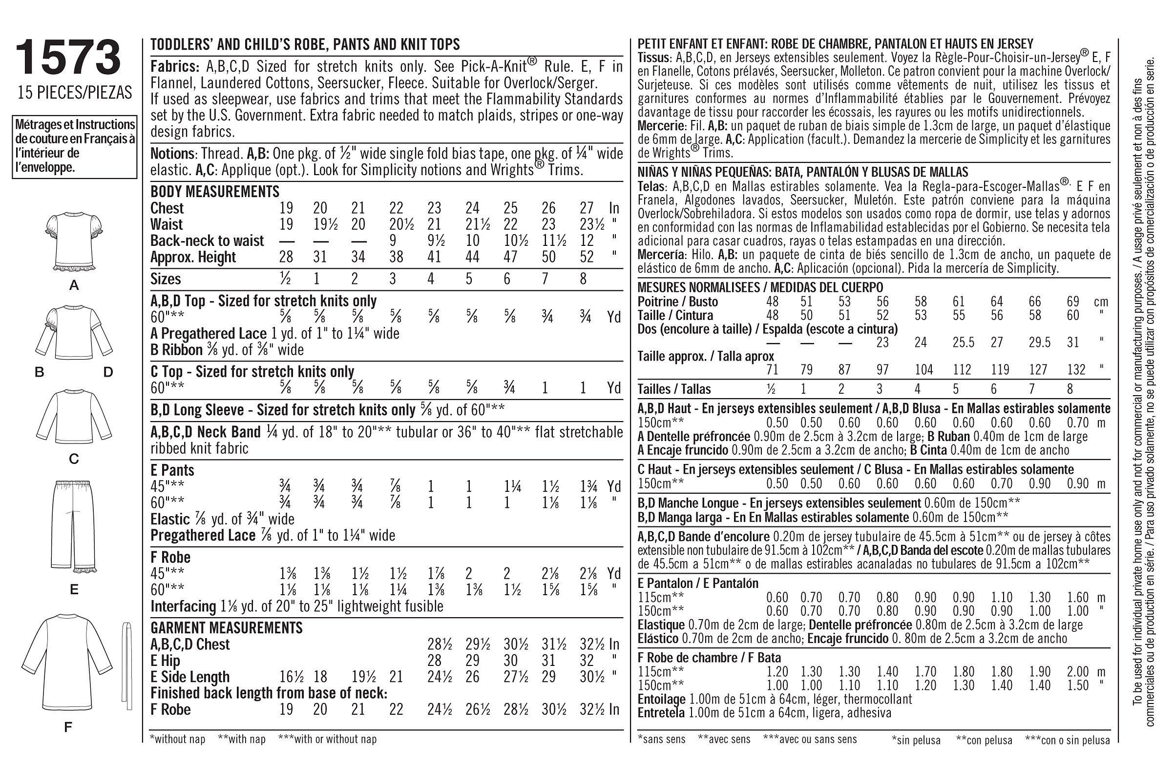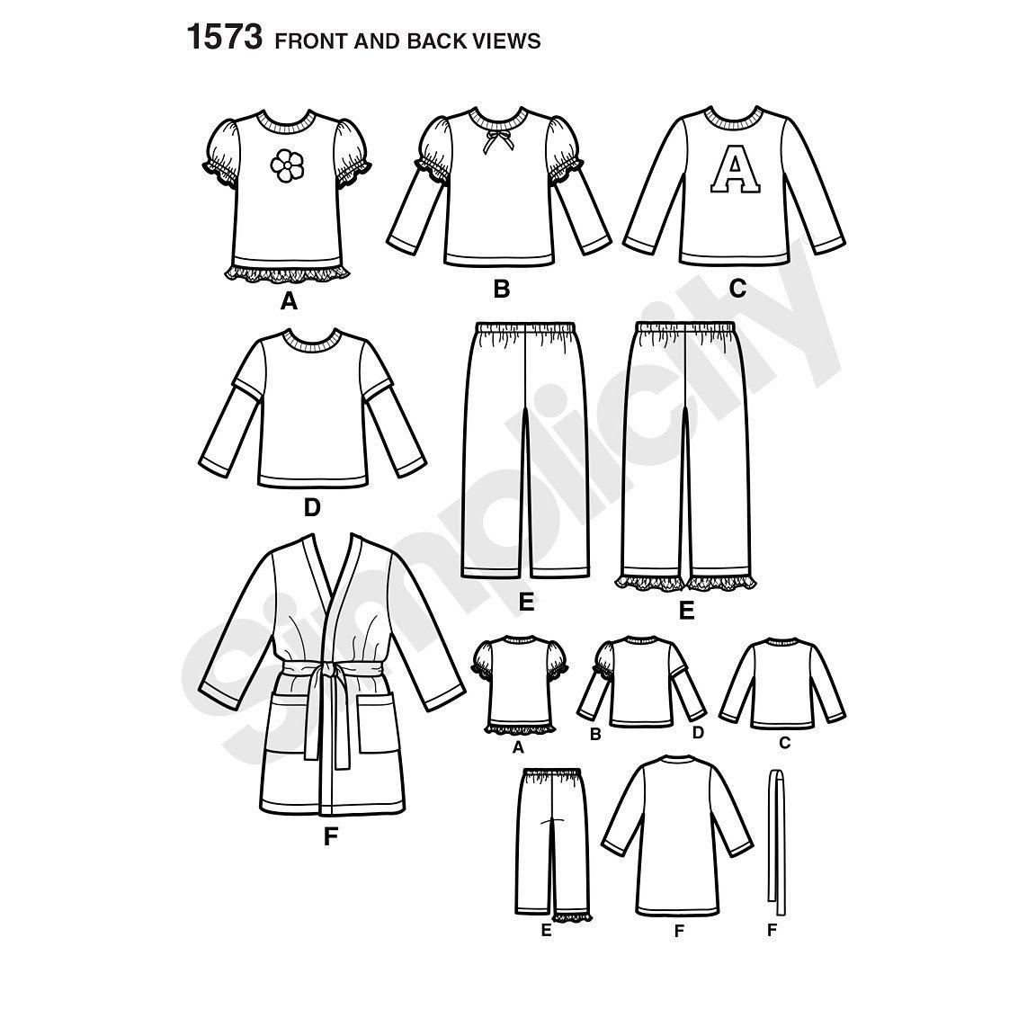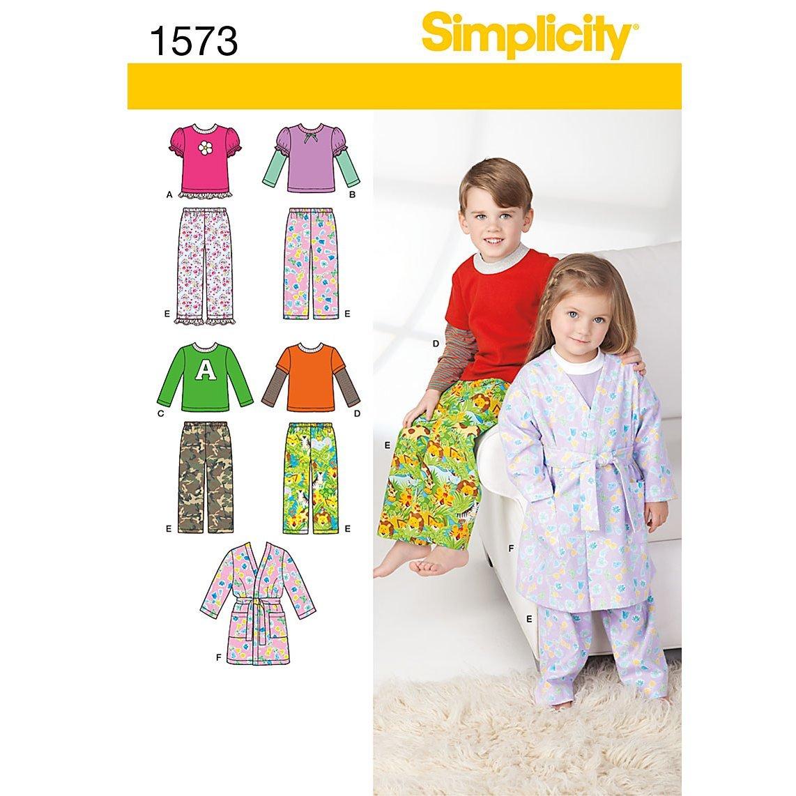 Simplicity sewing pattern for a toddlers' and child's robe, pants, and knit tops. Sizes: 4-8 years.
