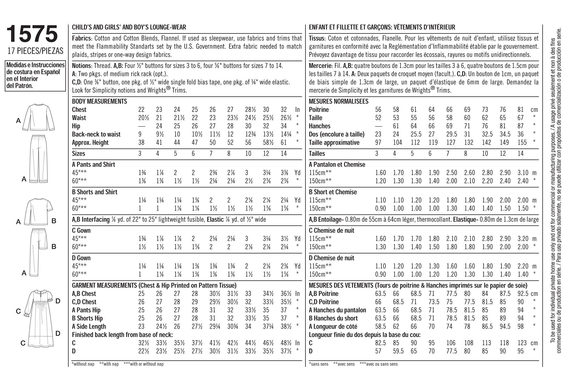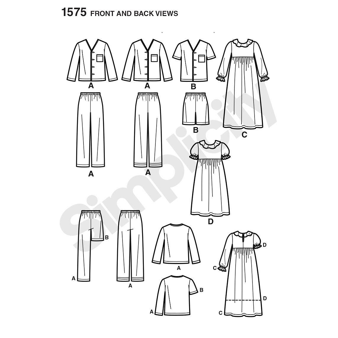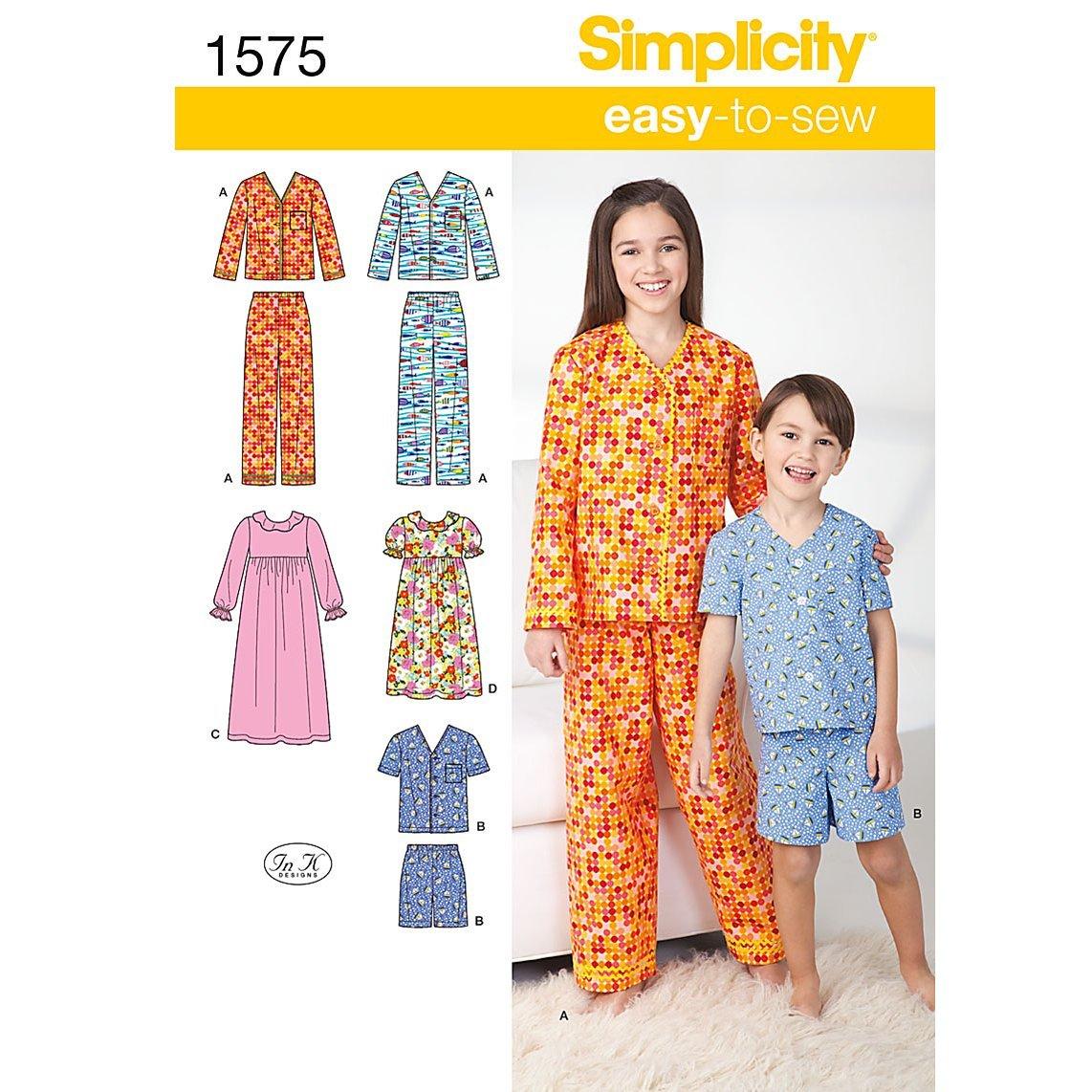 Simplicity sewing pattern for a child's, girls' and boys' lounge-gown in two lengths, pants, shorts and pocketed shirt with sleeve variations.