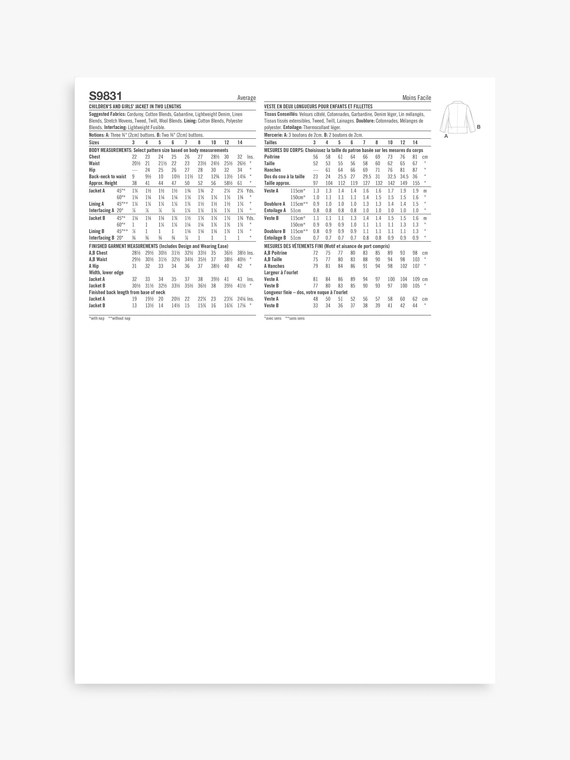 SimplicityChildren's and Girls' Jacket Sewing Pattern, S9831