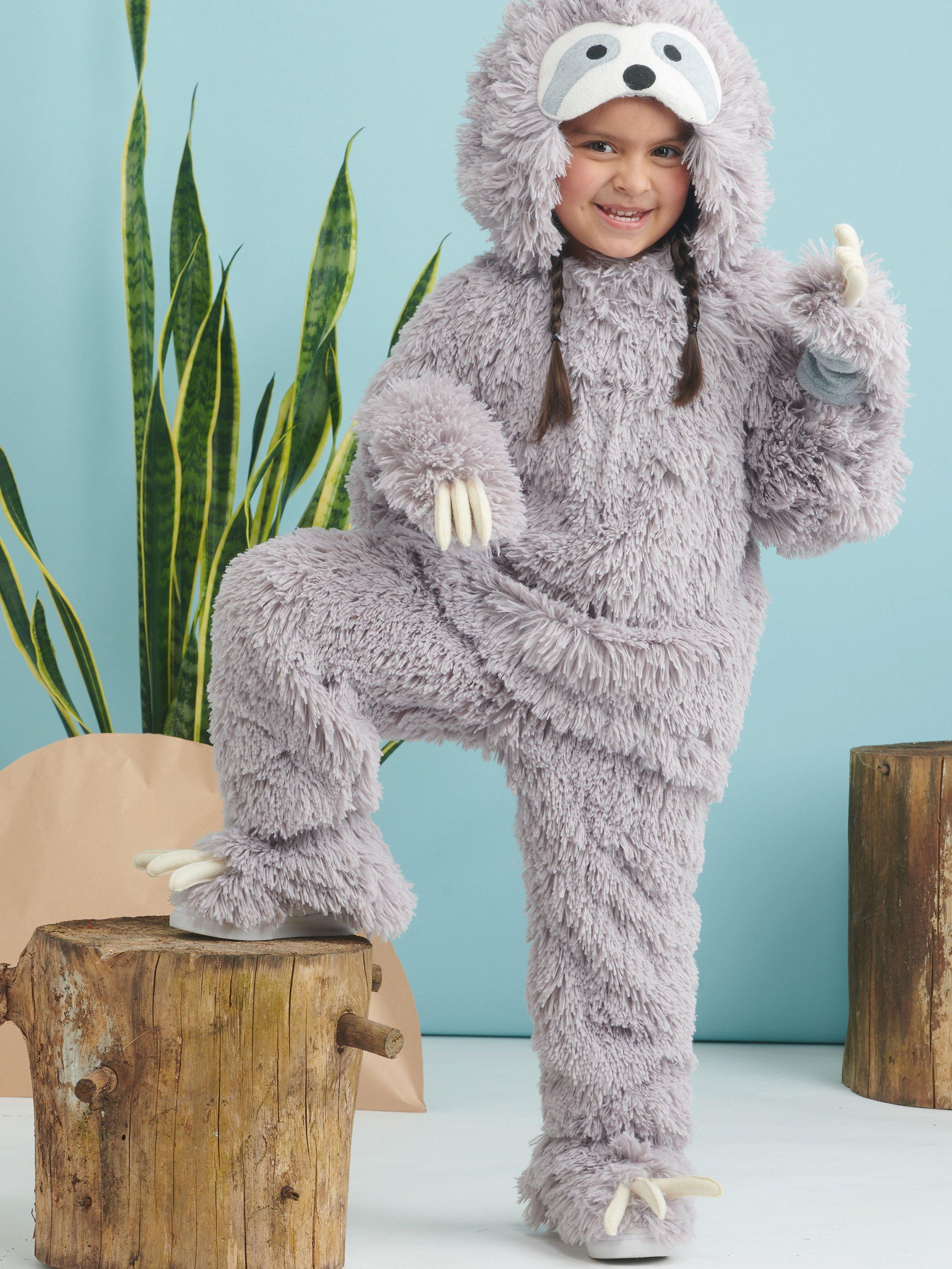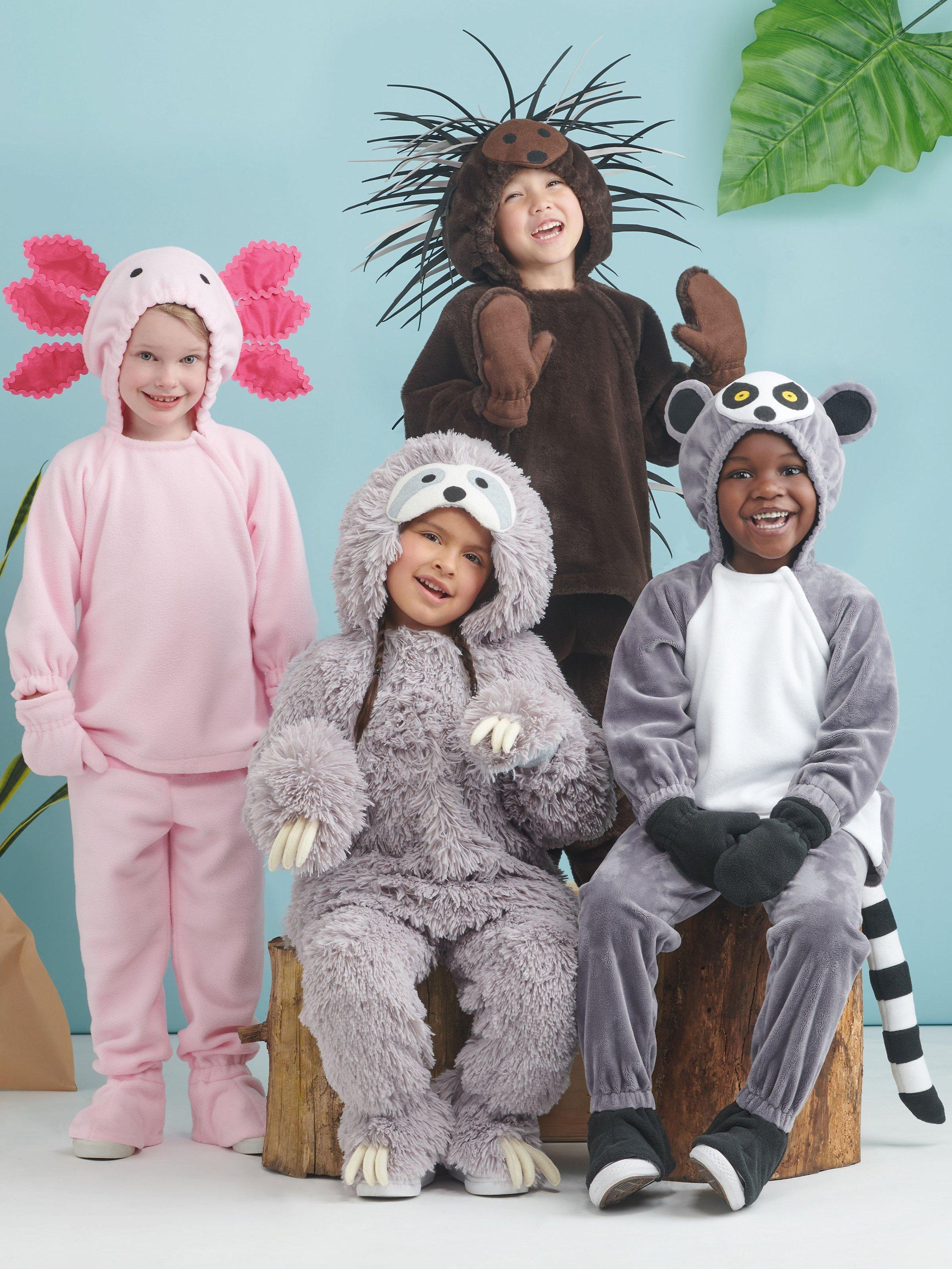 Cozy sloth, lemur, porcupine, and axolotl costumes have separate tops, pants and mittens for easy fit and comfy wear.