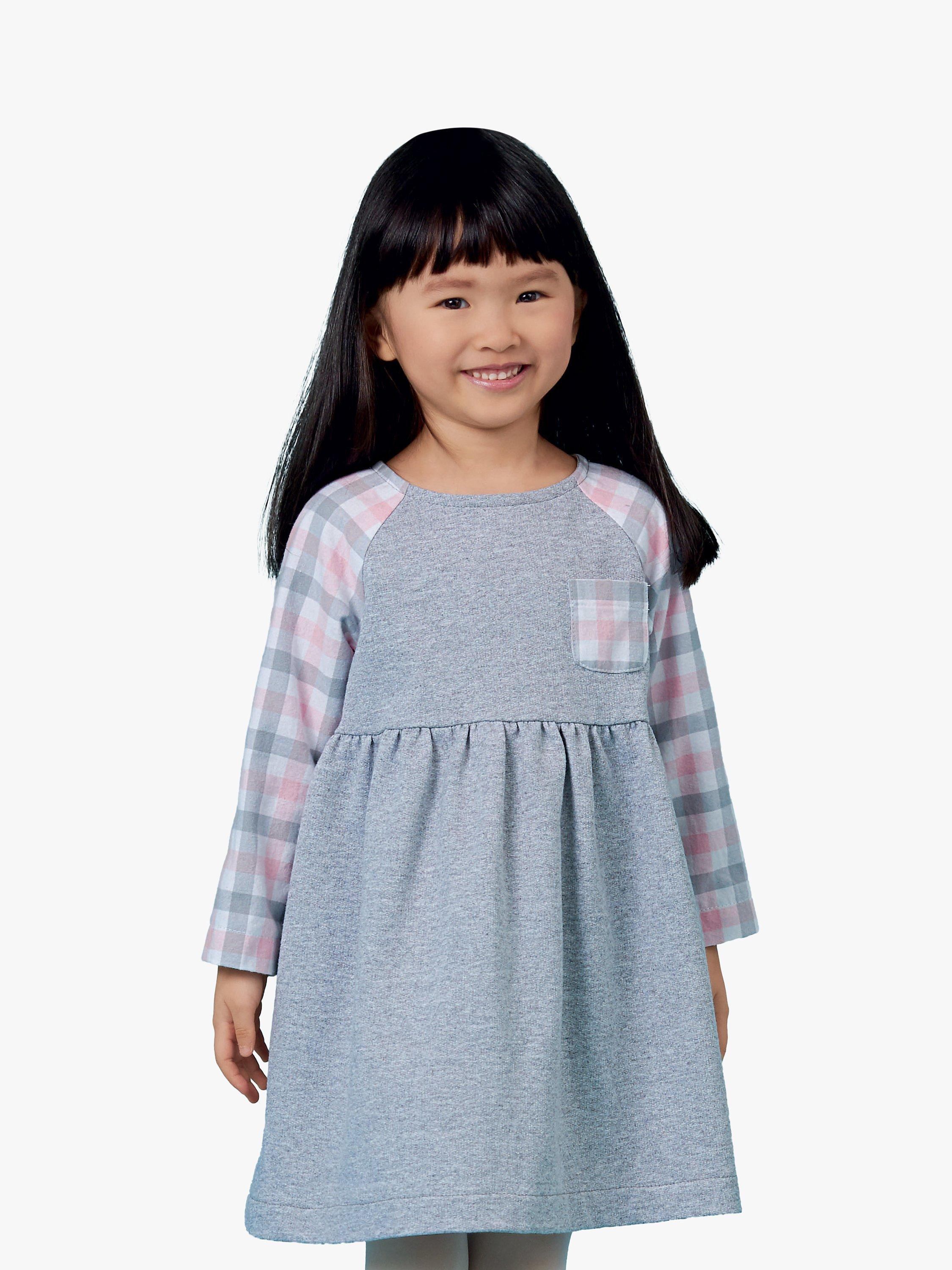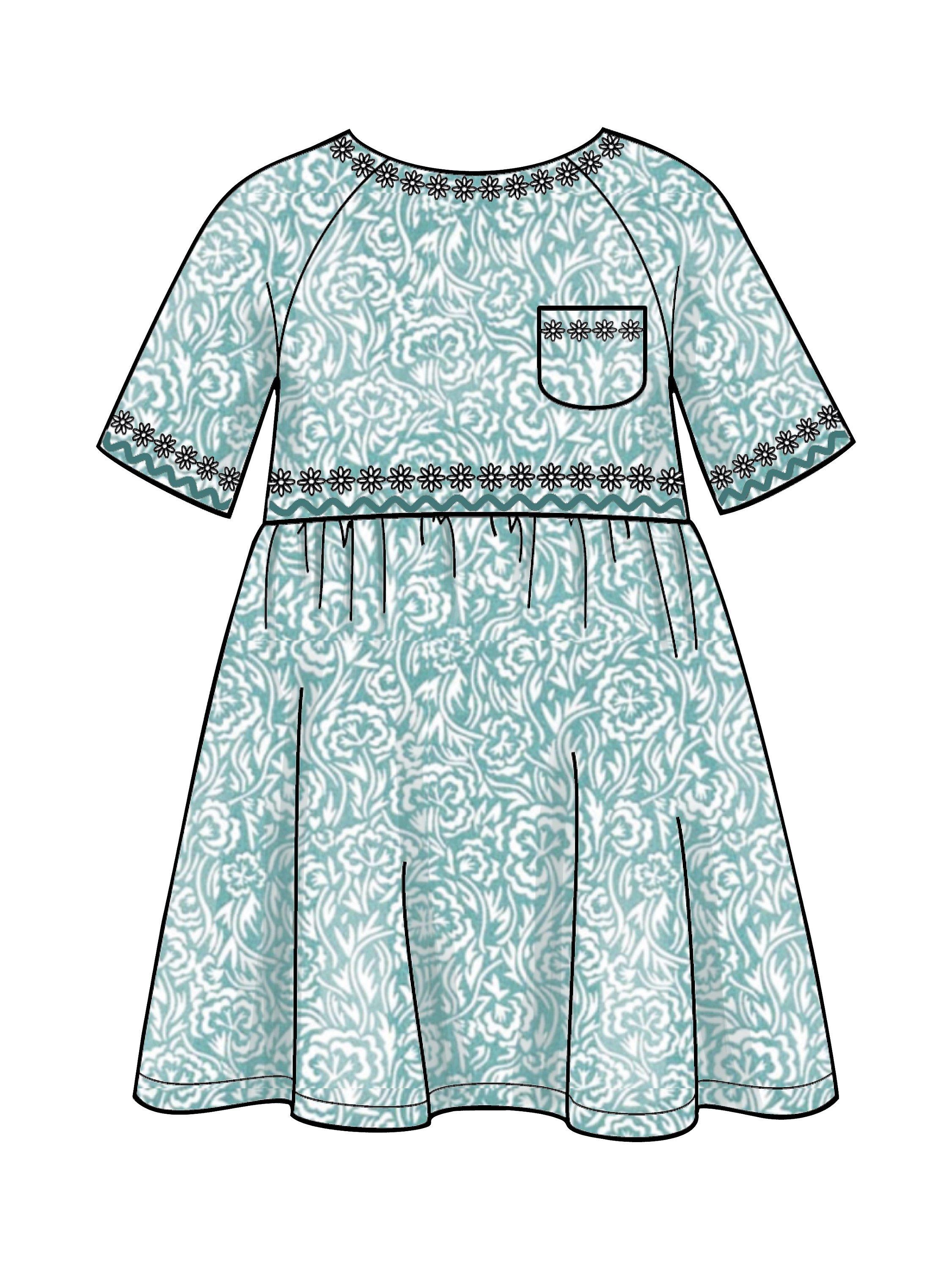Dress and top have skirt, gathered into waist seam, fastening at back neck. Raglan-style sleeves have style and length options. Pants are pull-on with elasticated waist.