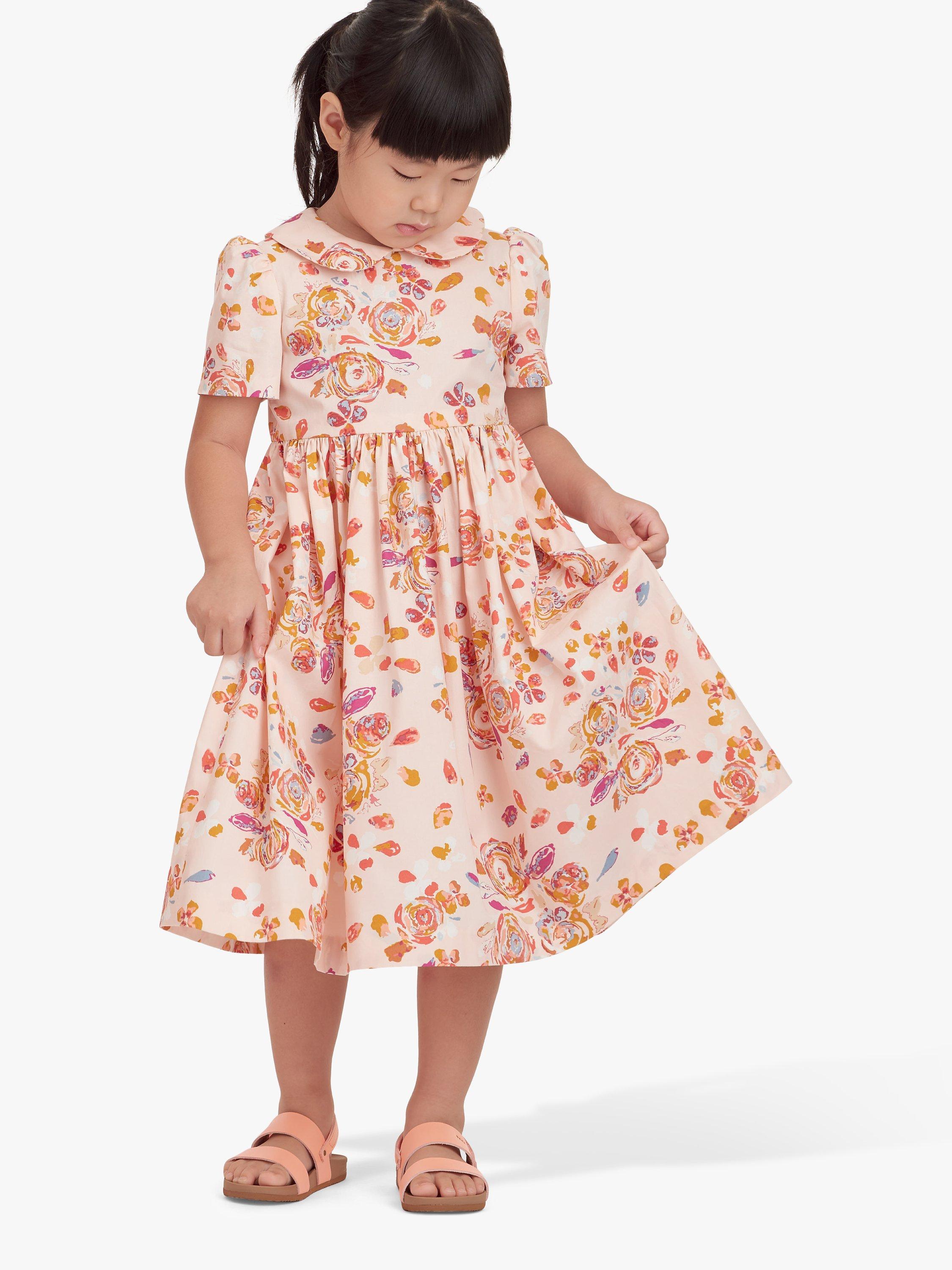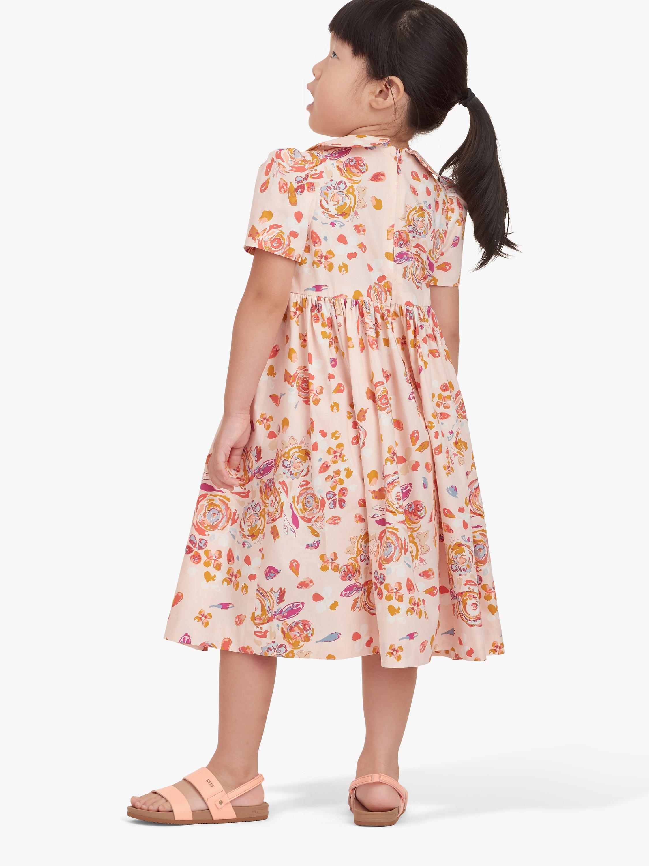 Children's dress with flared skirt gathered to bodice, short sleeves or sleeveless; collar, ruffle and pleat details.