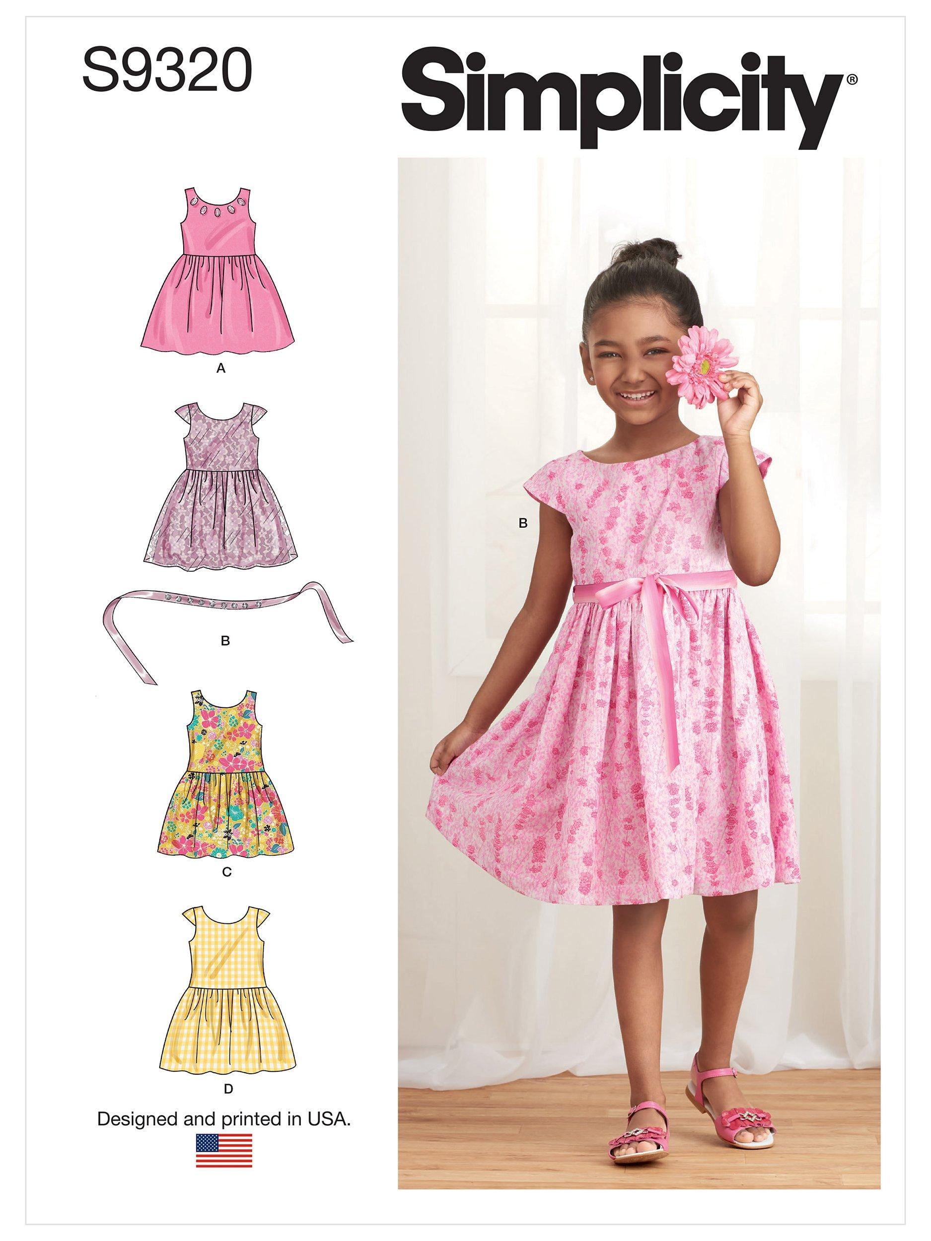 A Simplicity sewing pattern for children's gathered skirt dresses, with a lined bodice at the waist or below the waist, and a back zipper.