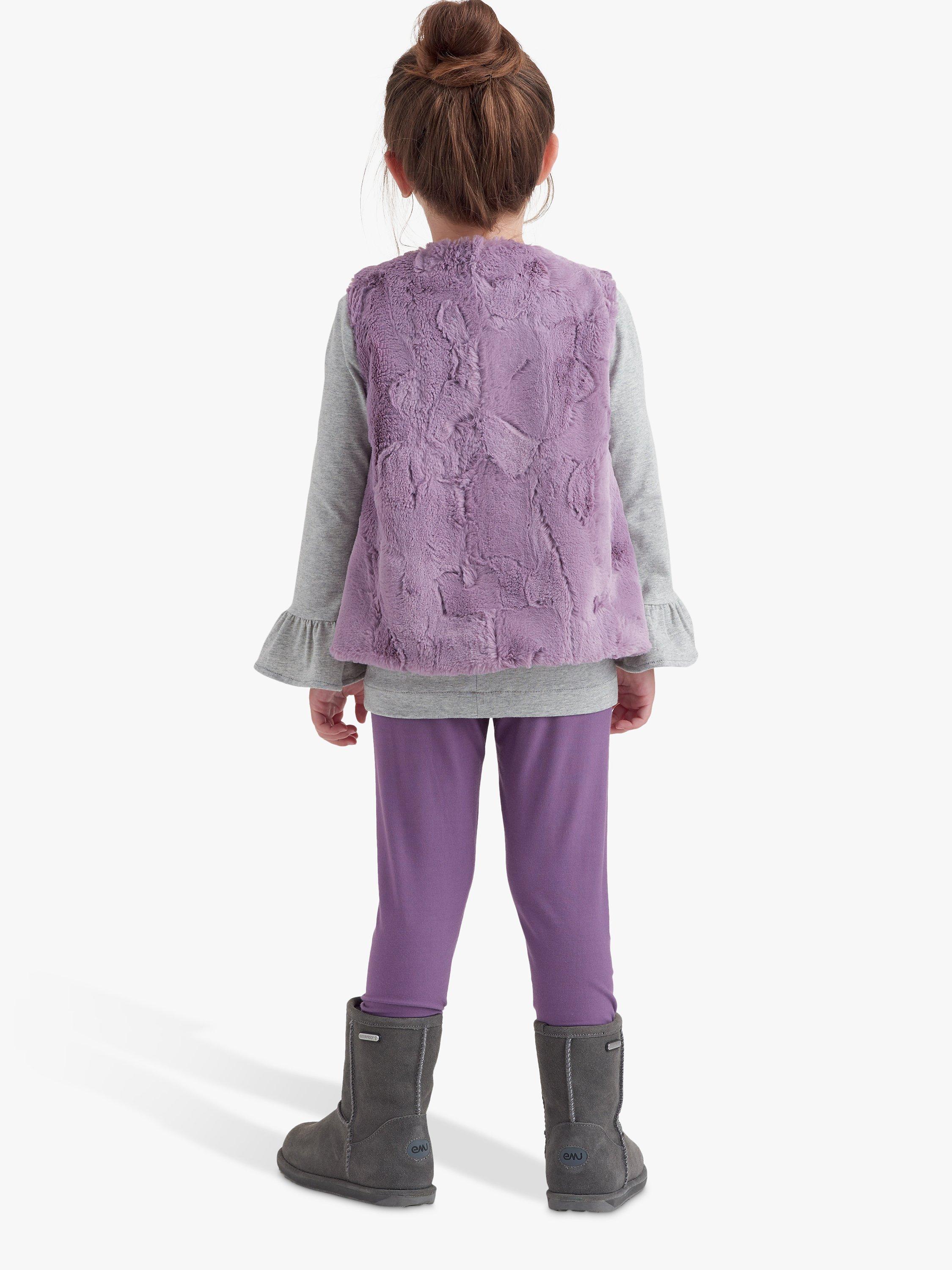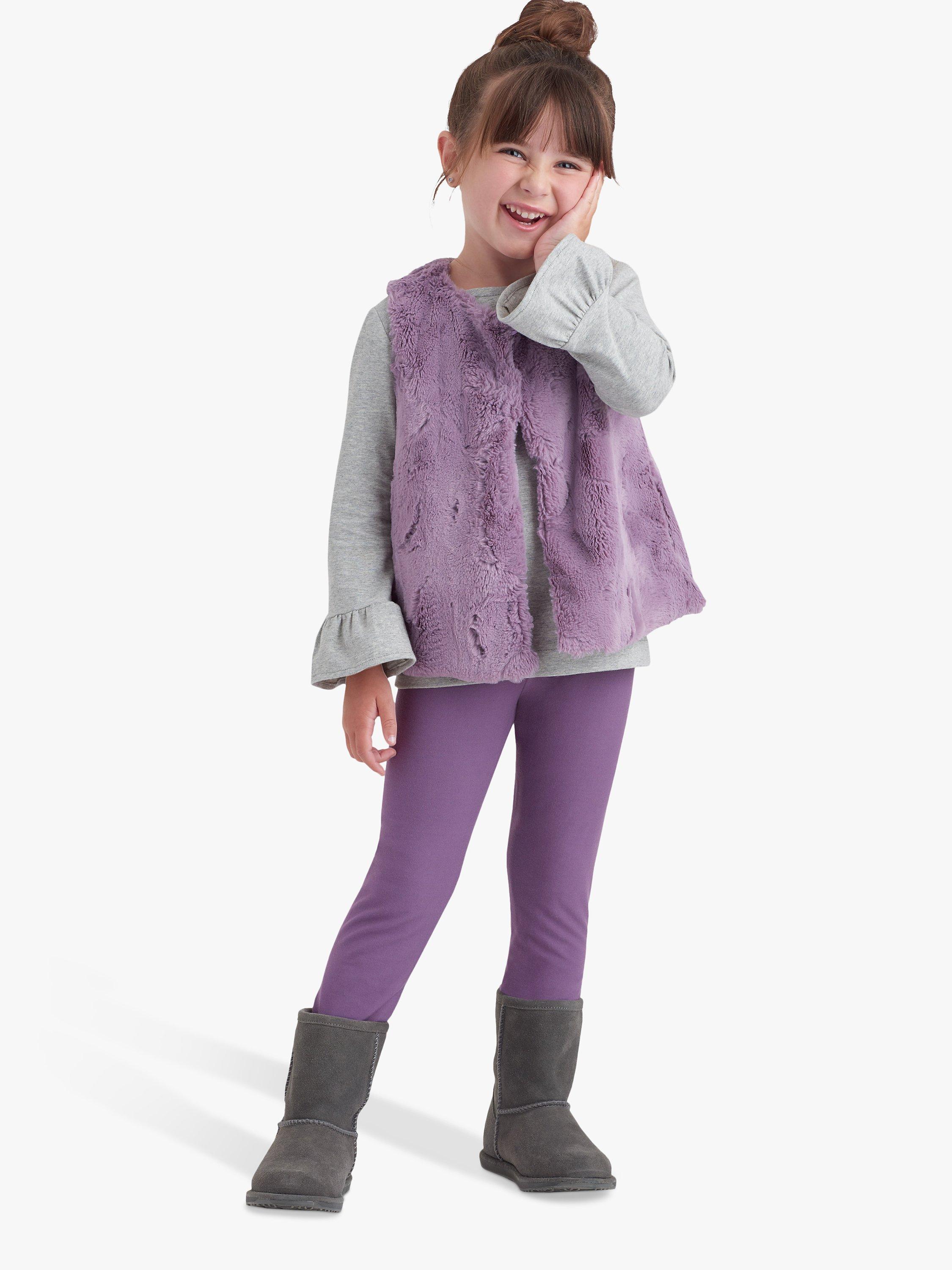 Pull-over tops with sleeve variations; lined vest has button closure; pull-on leggings have elastic waist.