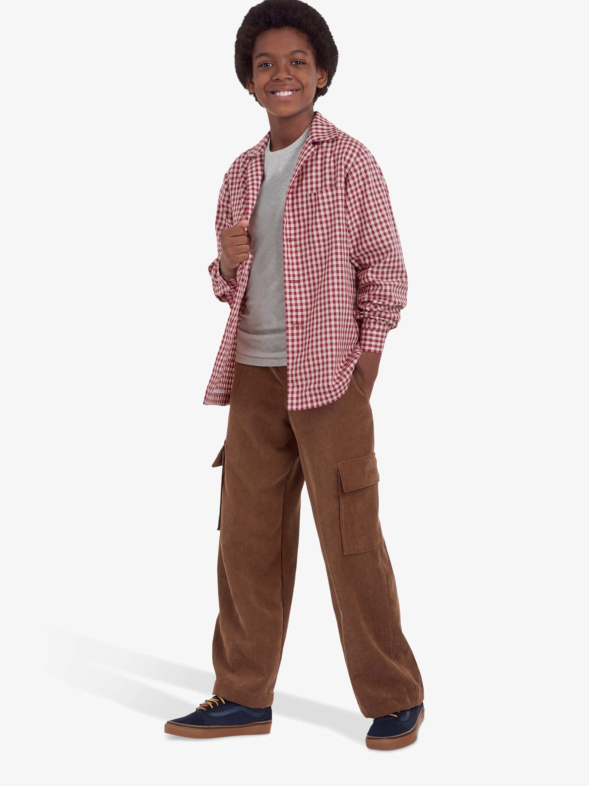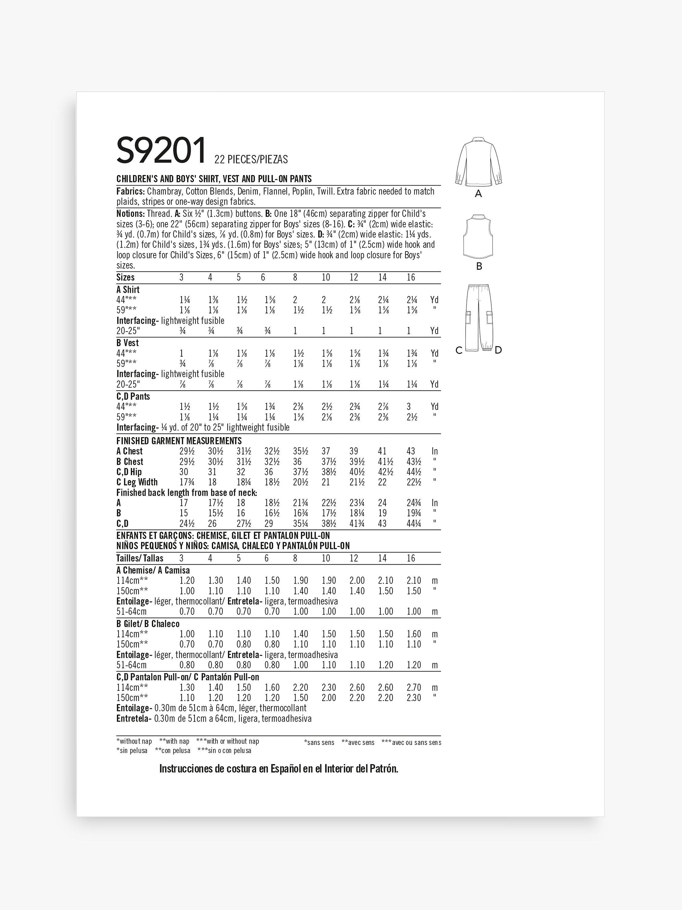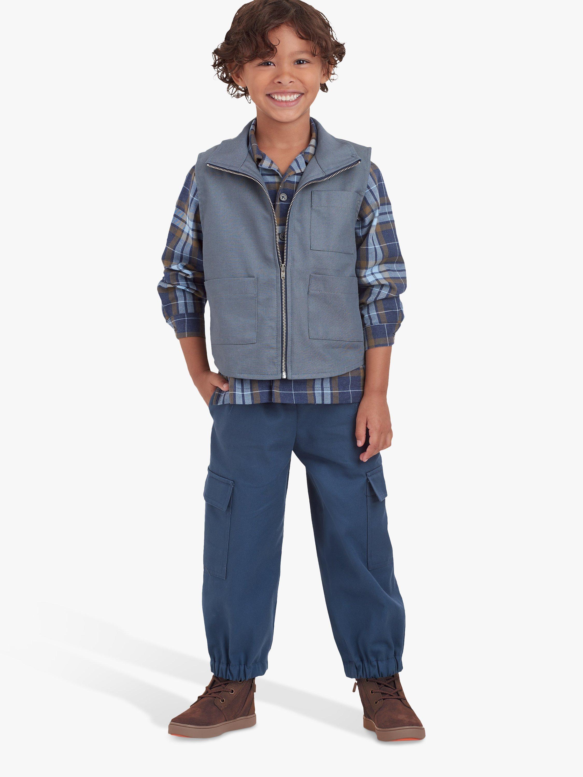 Children's long-sleeved shirt, zipped front vest with collar, pull-on pants with cargo pockets and optional elastic hem at ankle.