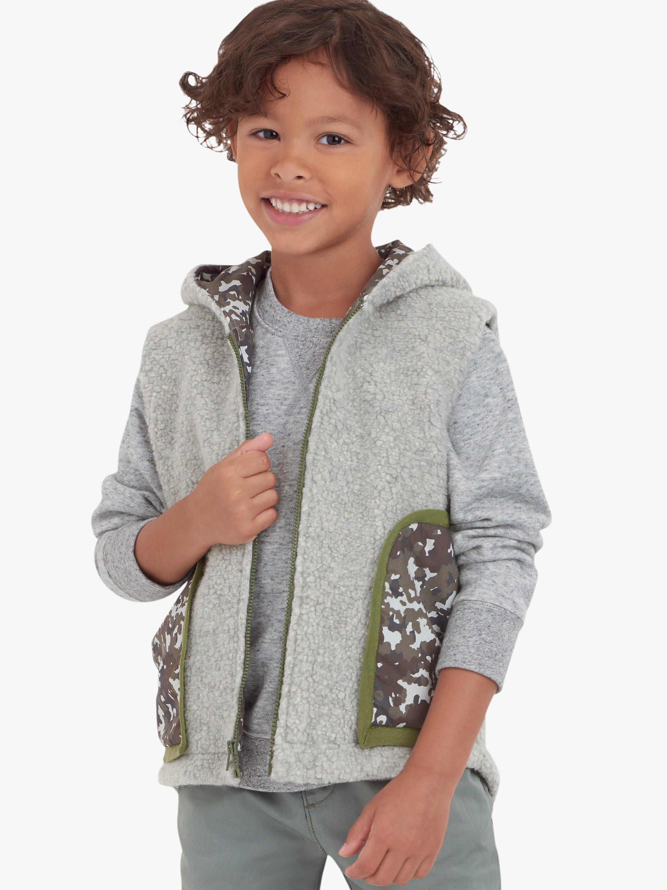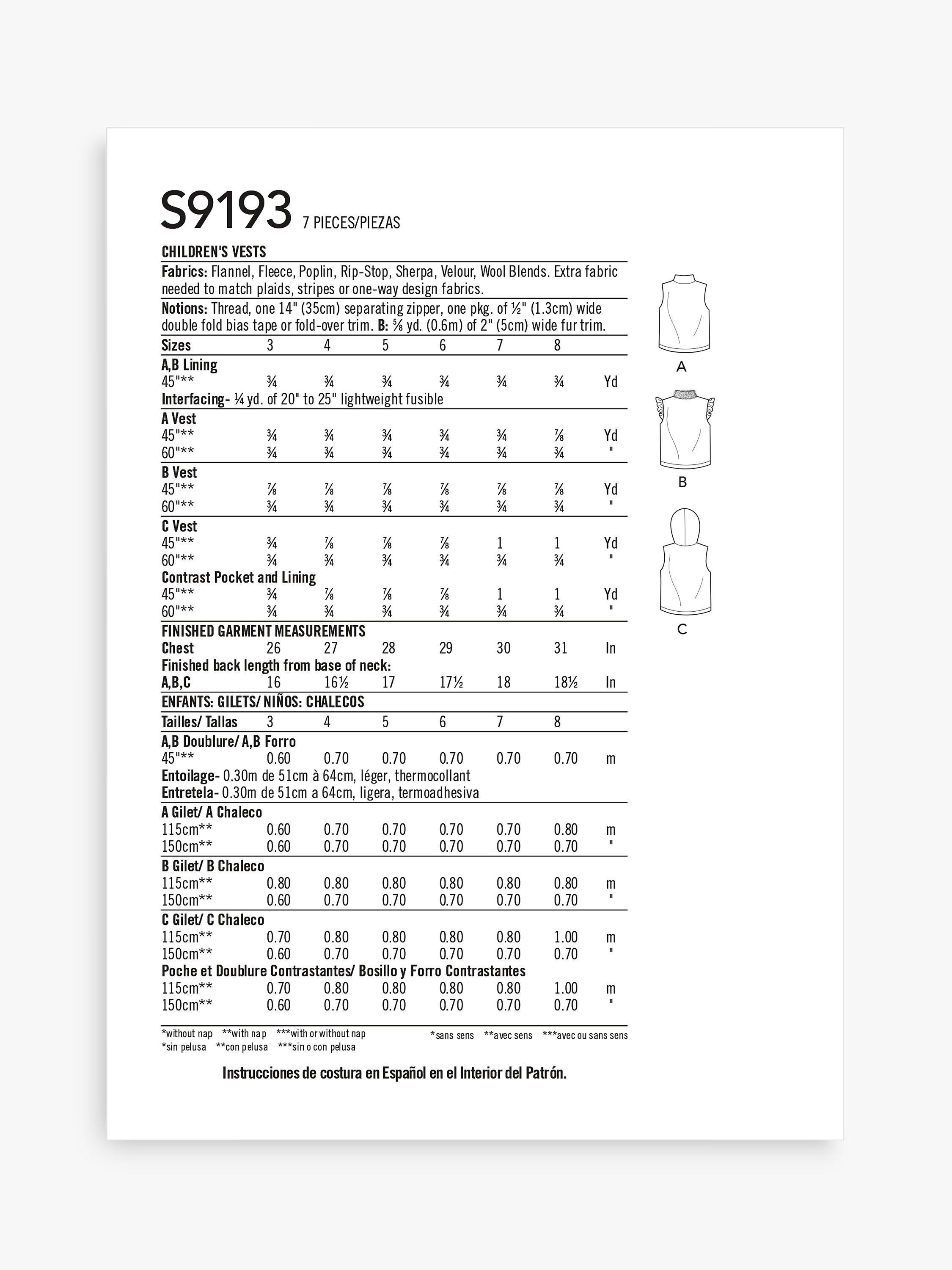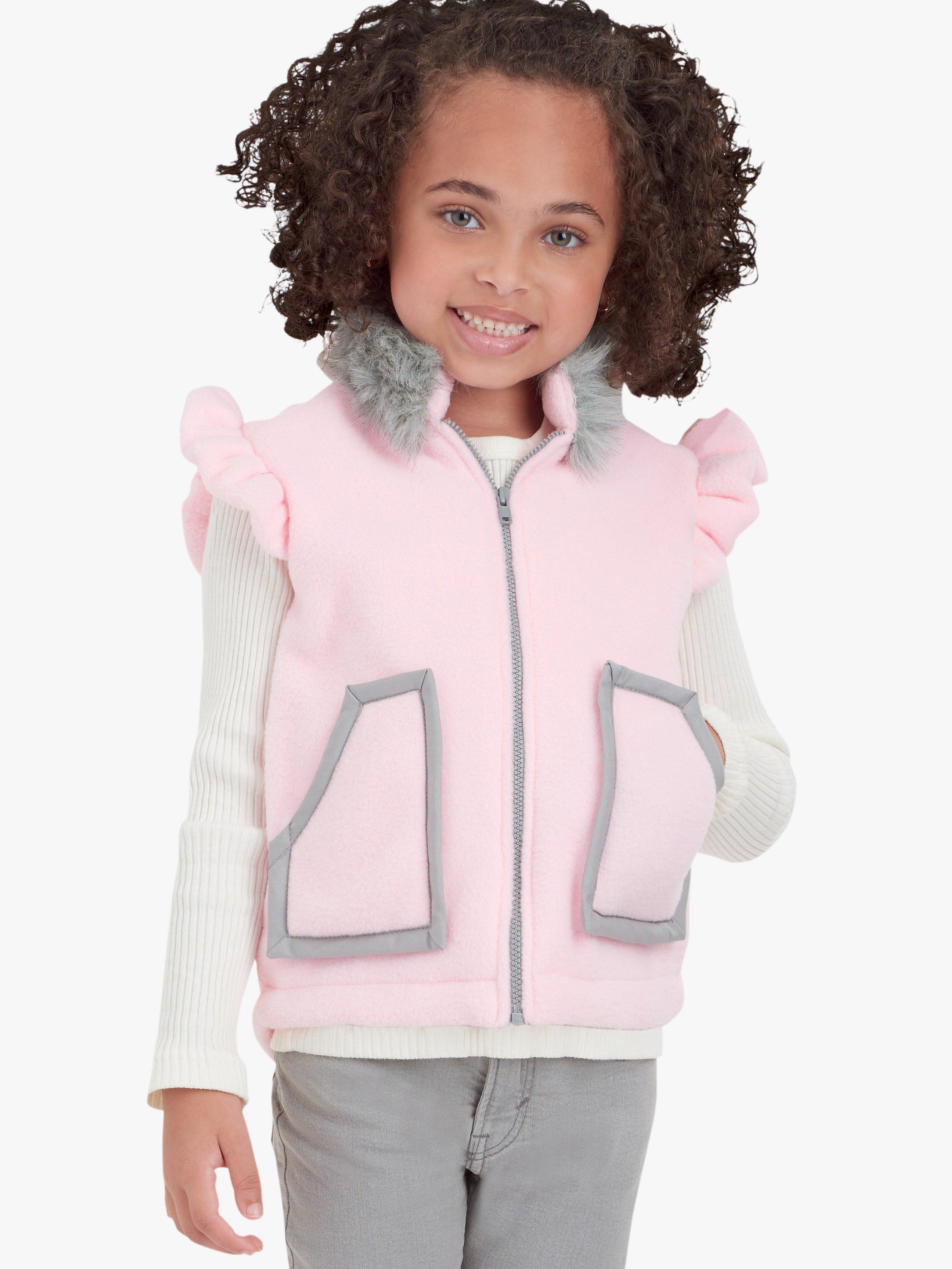 Children's zip-front vests with collar or hood variations and lined with fashion fabric.