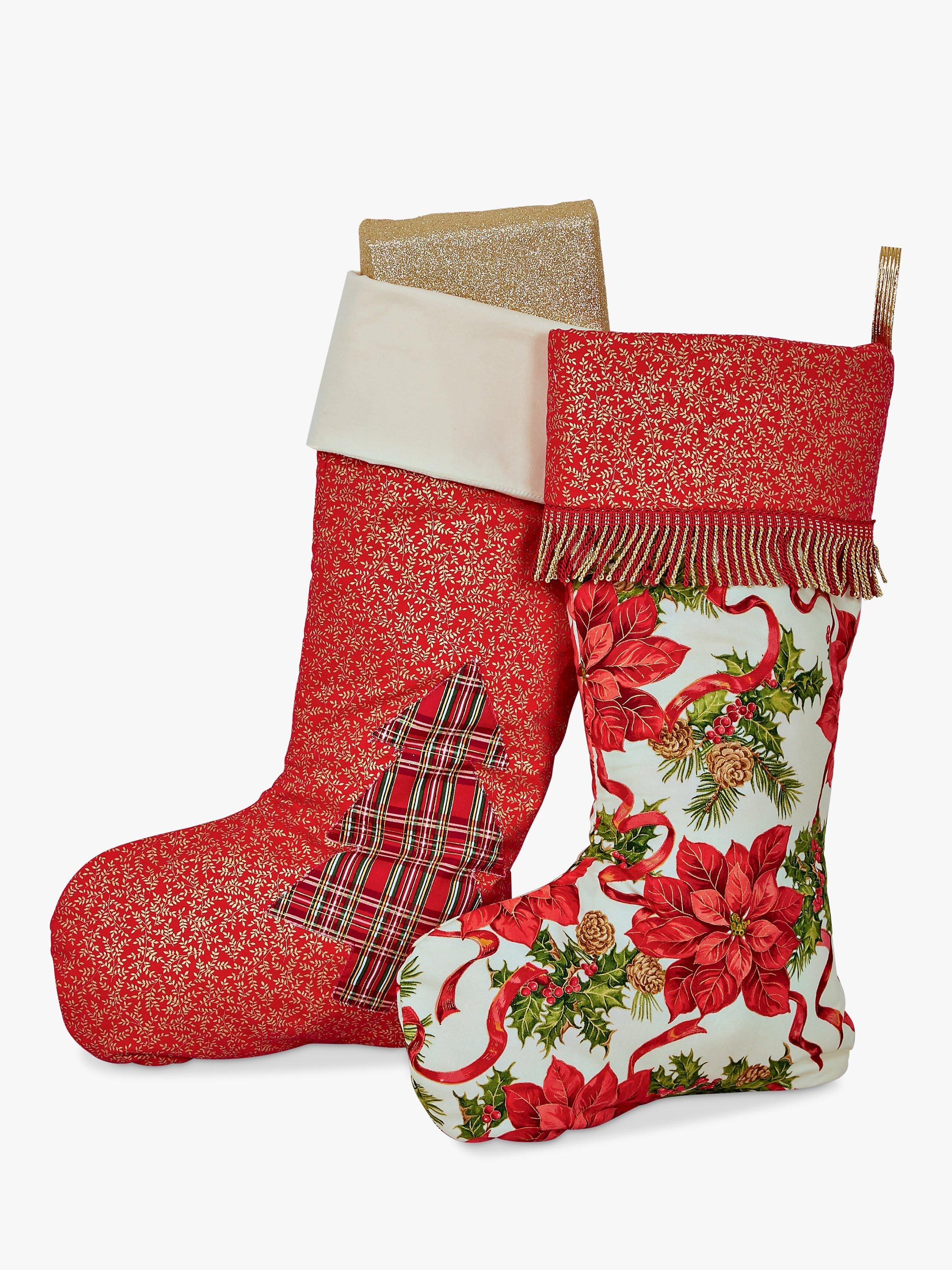 Christmas textiles including stockings, gift sacks and a tree mat.