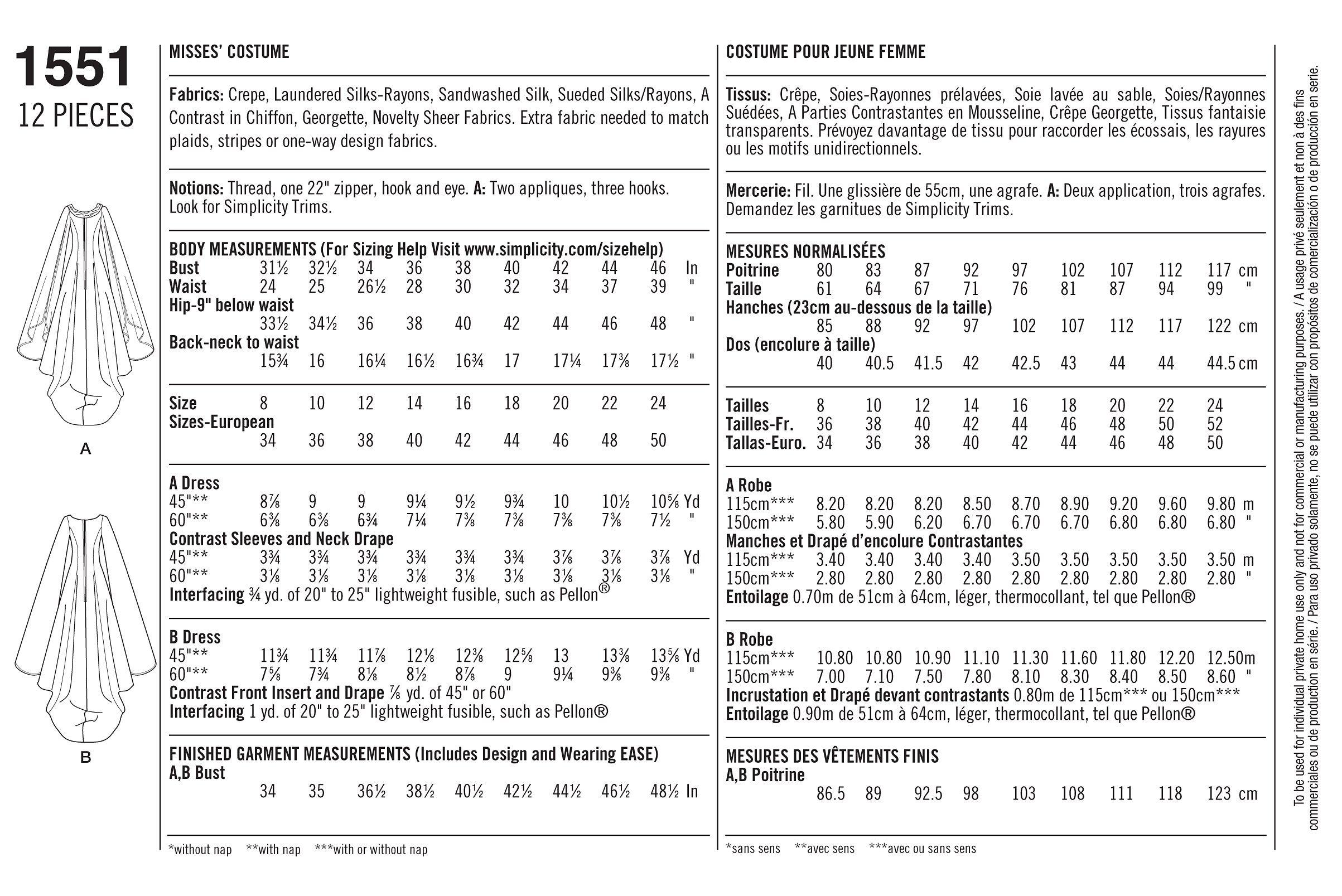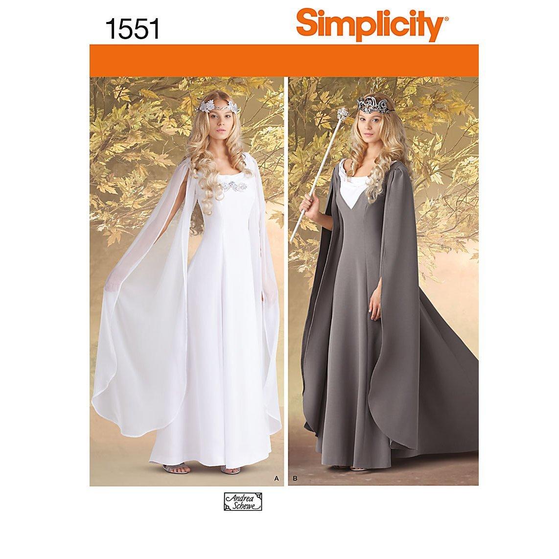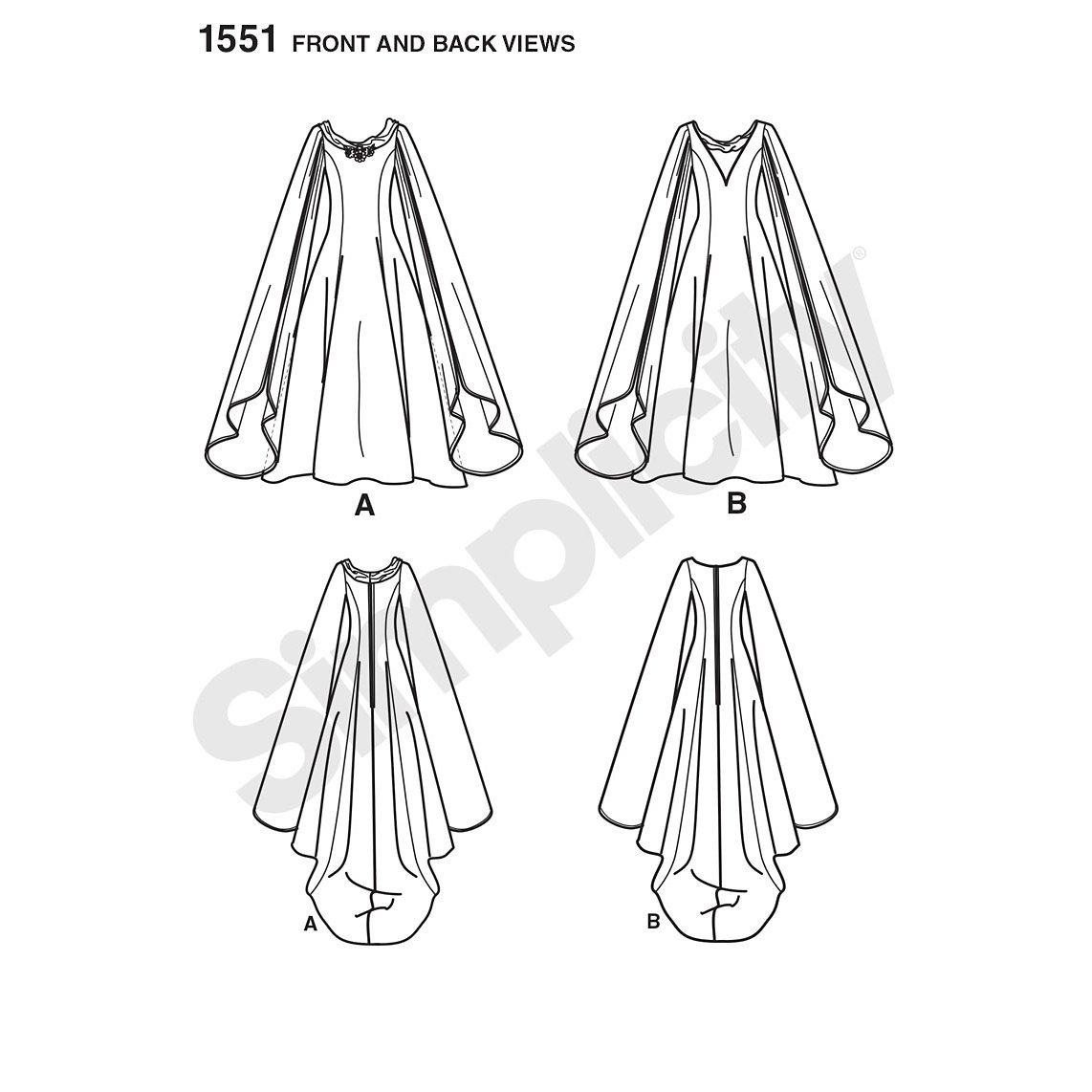 Simplicity sewing pattern for a Misses costume gown with hanging sleeves, scoop neckline and collar variations by Andrea Schewe.