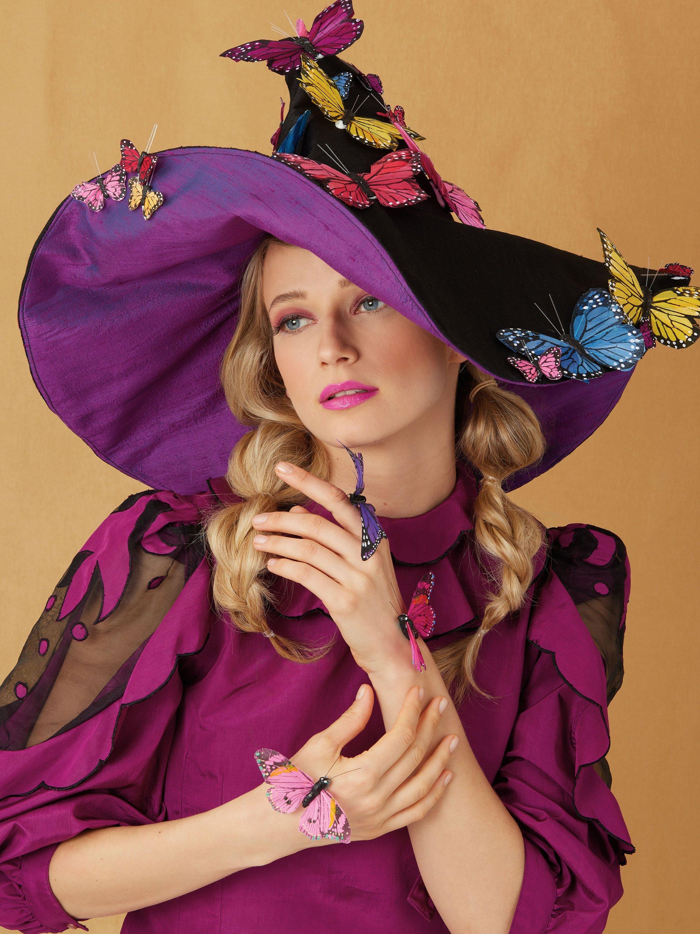 Hats with wired brims in two sizes and contrast under brims and linings are the perfect base for embellishments, creating a custom character accessory. Witch and wizard hats are wired at the back seam as well, allowing for unique molding and shaping. Flat top crown hat is perfect for historical and theater use. Single layer lace-trimmed veil slides easily over any hat for added drama. See envelope for more information.