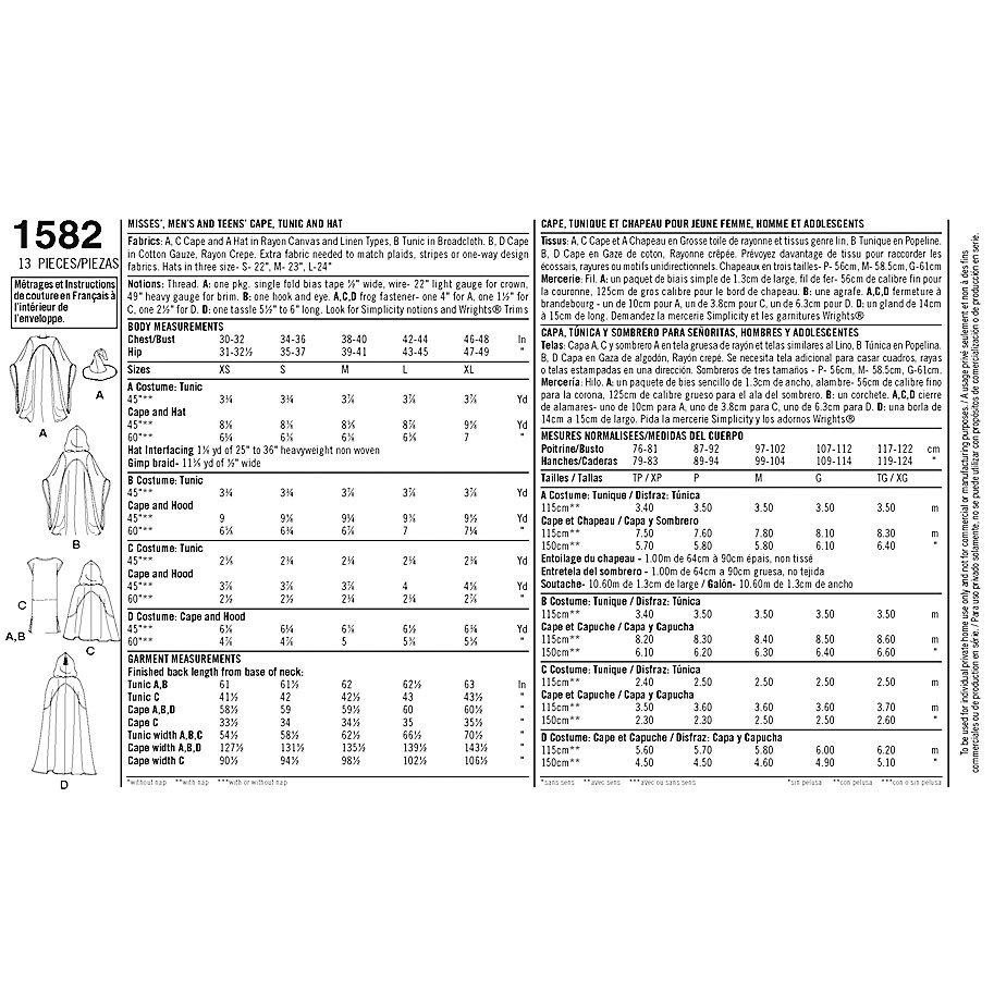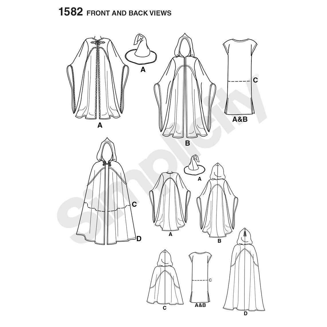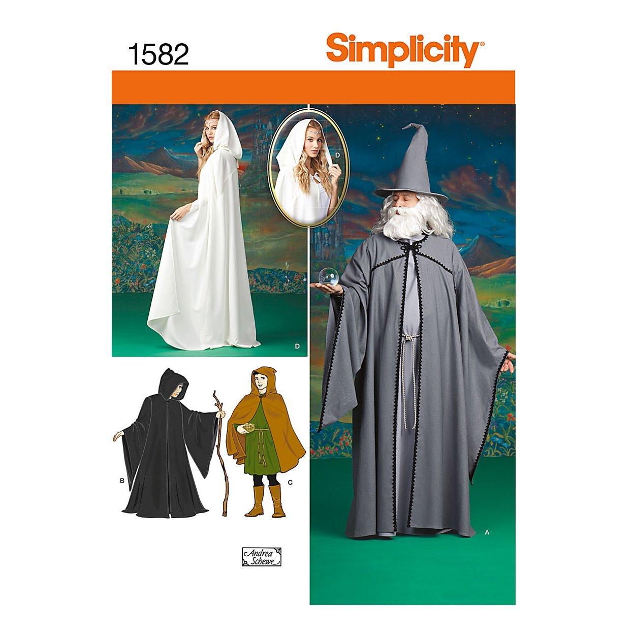 Simplicity sewing pattern by Andrea Schewe for making a hooded cape costume in different lengths suitable for women, men and teens. Sizes: XS (chest/bust 30-32", hip 31-32.5"), S (chest/bust 34-36", hip 35-37"), M (chest/bust 38-40", hip 39-41"), L (chest/bust 42-44", hip 43-45"), XL (chest/bust 46-48", hip 47-49").
