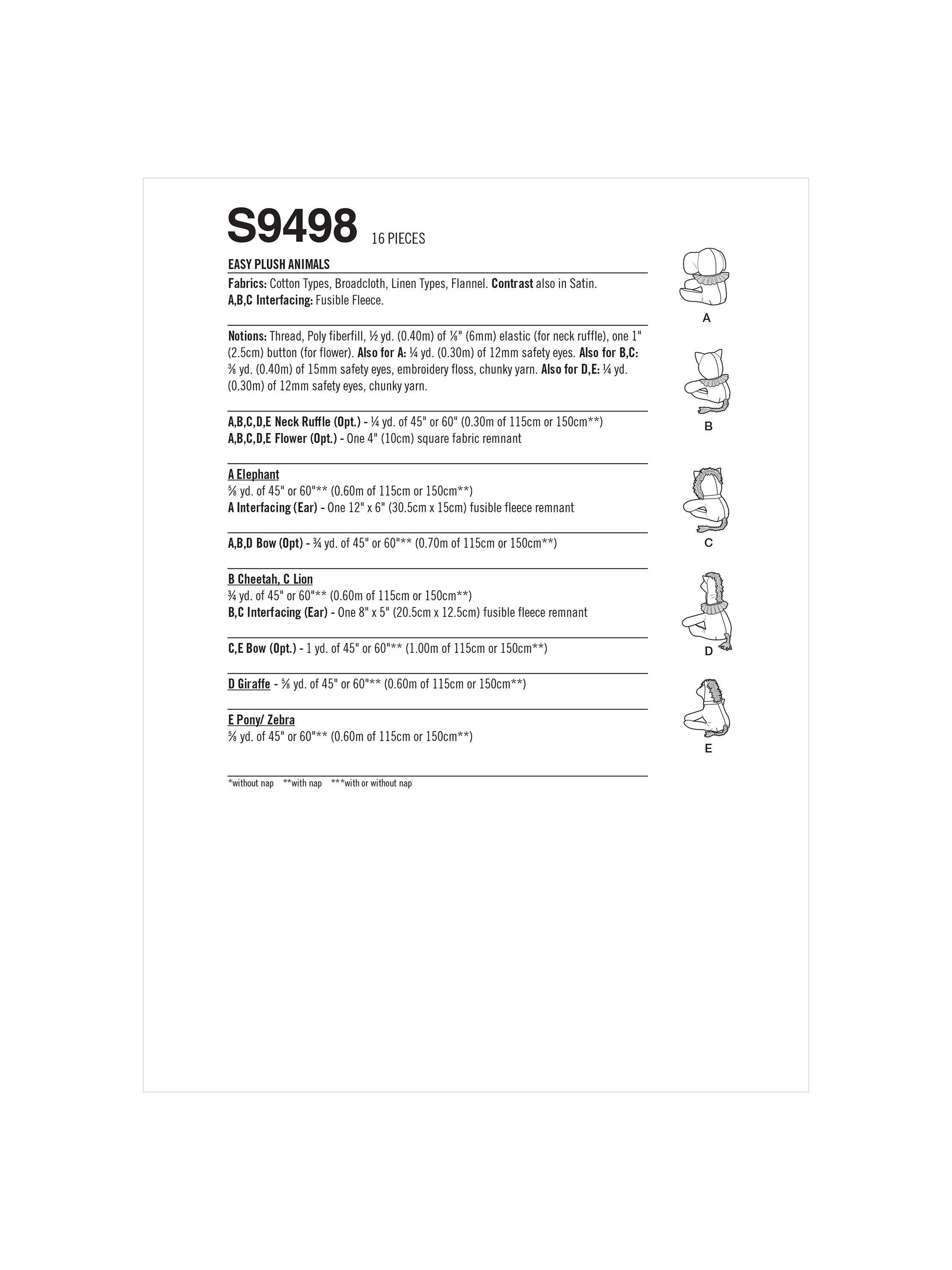 SimplicityEasy Plush Animals Sewing Pattern, S9498, OS