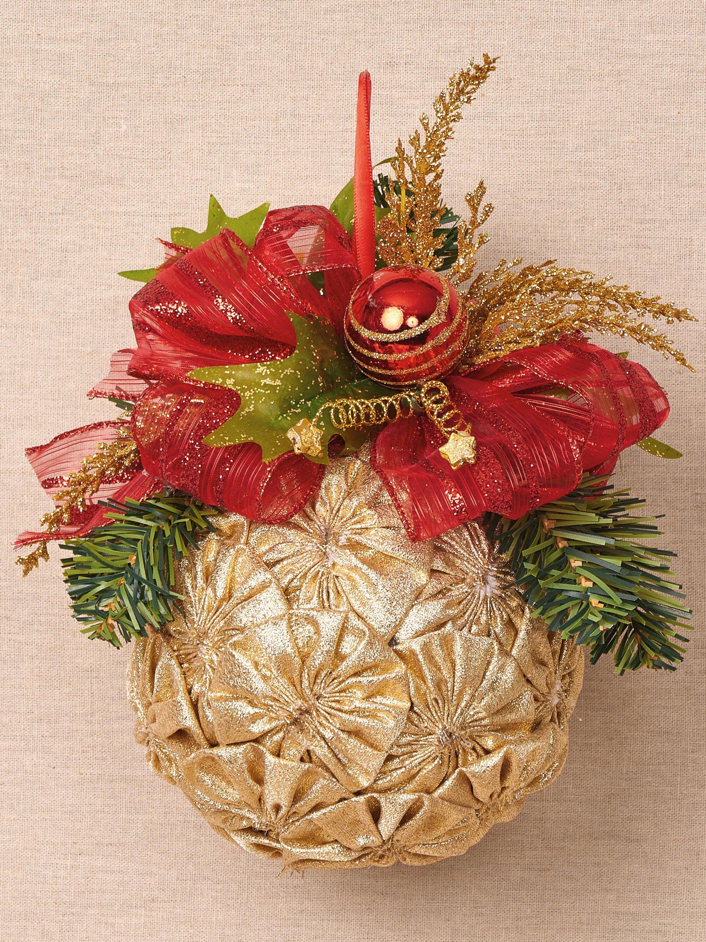 15cm diameter kissing ball has ribbon loop for hanging, ribbon bow, sprigs and ornaments.