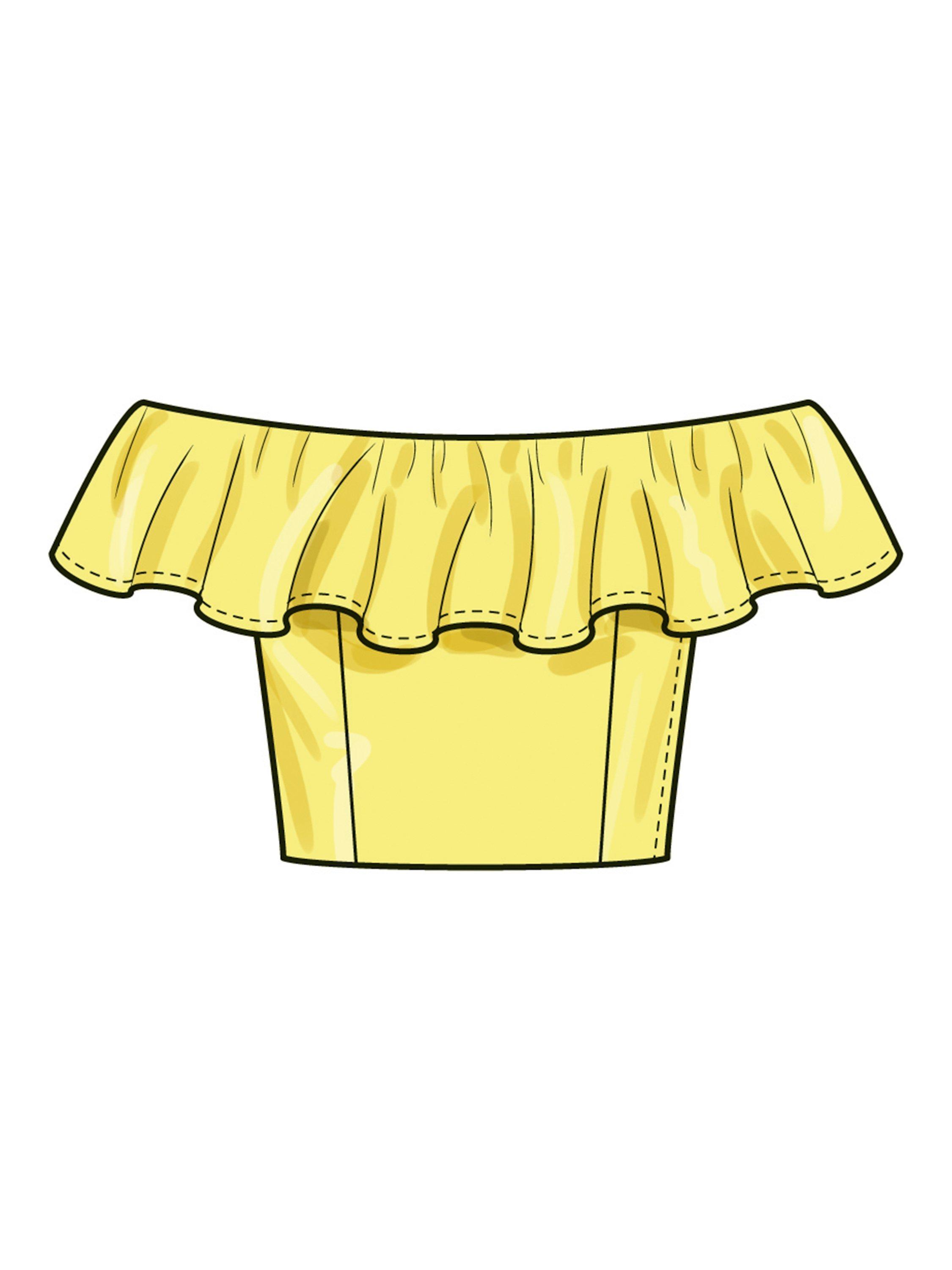 Girls' off the shoulder top has princess seams and ruffle neckline with or without spaghetti straps. Midi or ankle length skirt has elastic waistband and gathered ruffle hem.