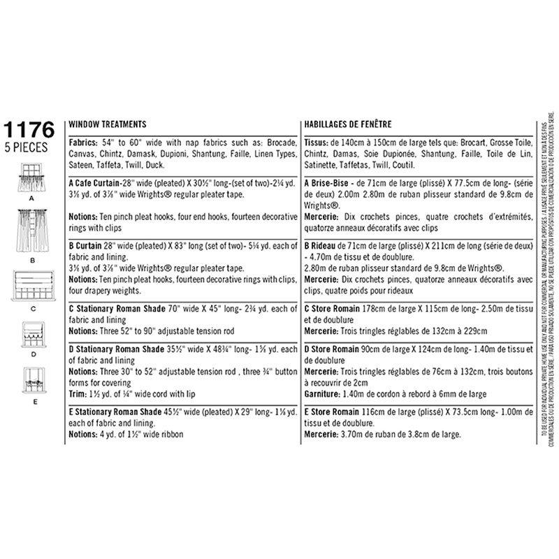 This window treatment pattern includes café curtains and full length curtains that use pleater tape for windows approx. 35" wide, stationary roman shades for 35" and 70" windows and tie up shades that use mounting boards.