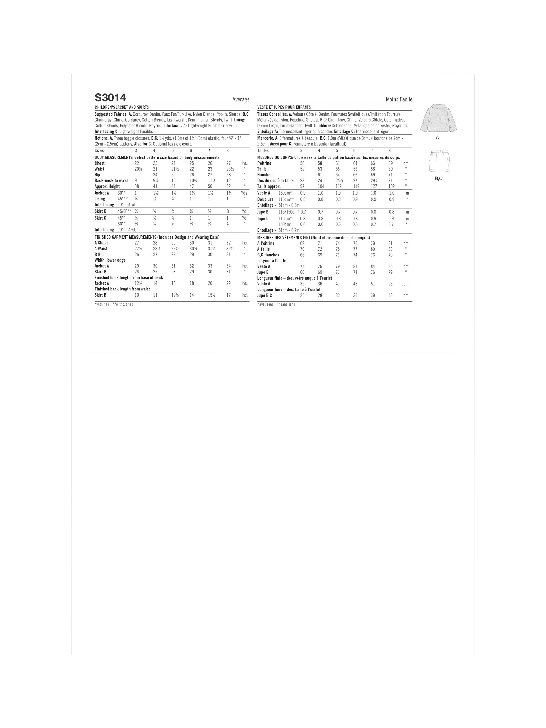 Relaxed fit jacket has front toggle closure, shaped collar, and side seam pockets. Pull-on skirts have elastic waistband, side seam pockets and front button detail. View C has front patch pocket with flap and optional toggle closure.