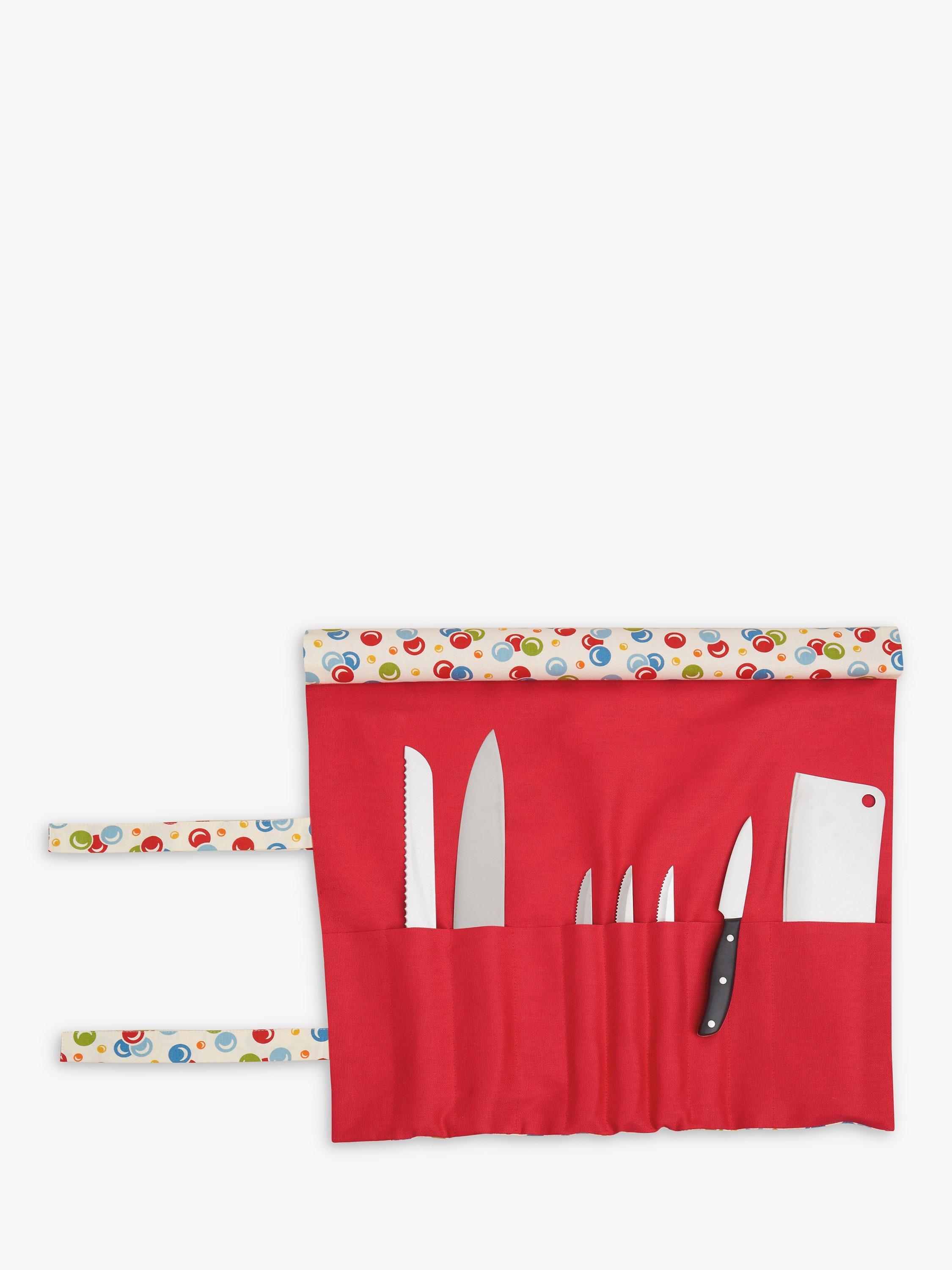Knife roll, hanging towel, and gauntlet length oven mitt have contrast fabric accents.