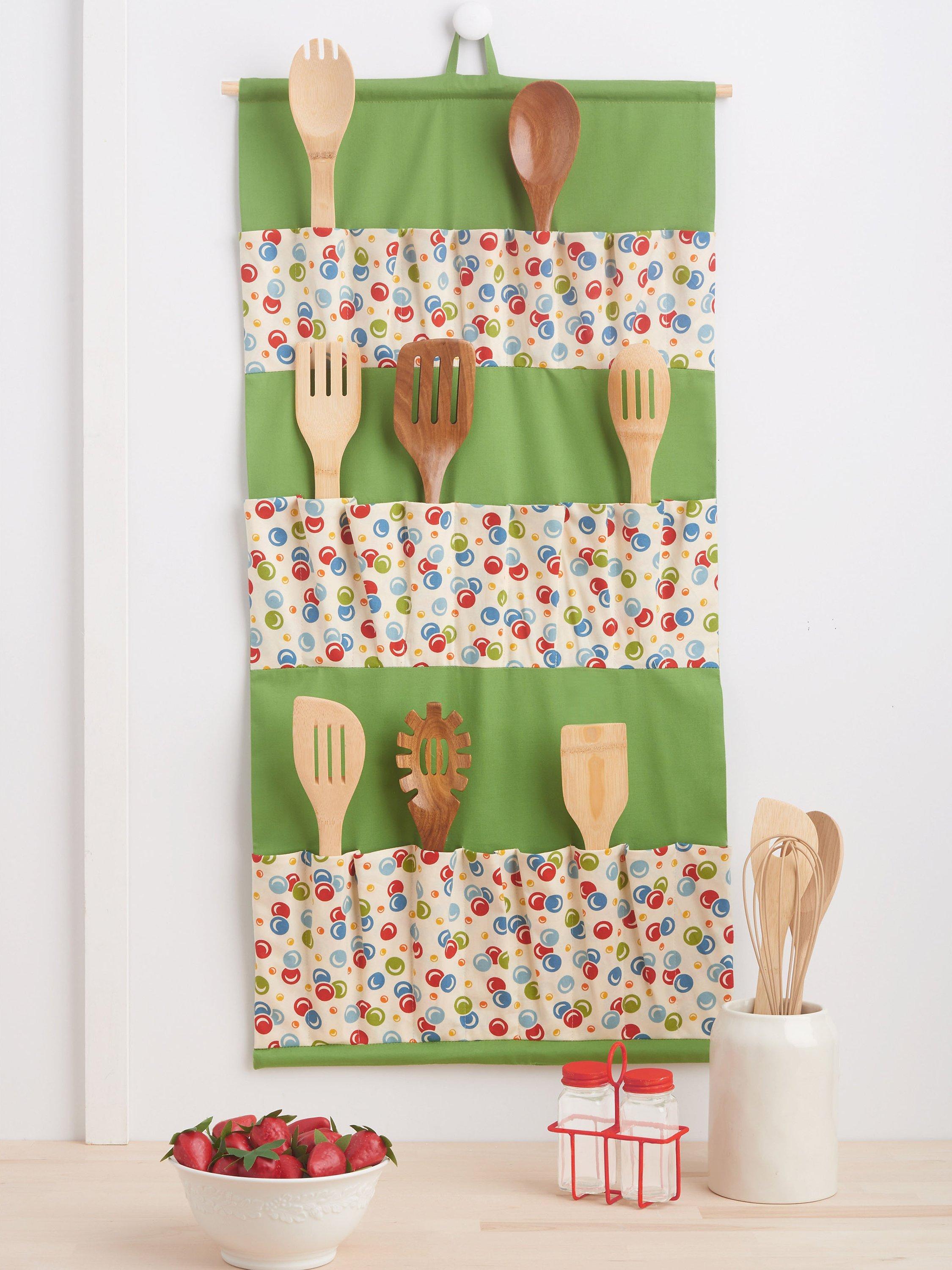Hanging utensil and pot lid holders have contrast pockets and wooden dowel supports. Hanging bag dryer uses chopsticks, just right for plastic produce bags.