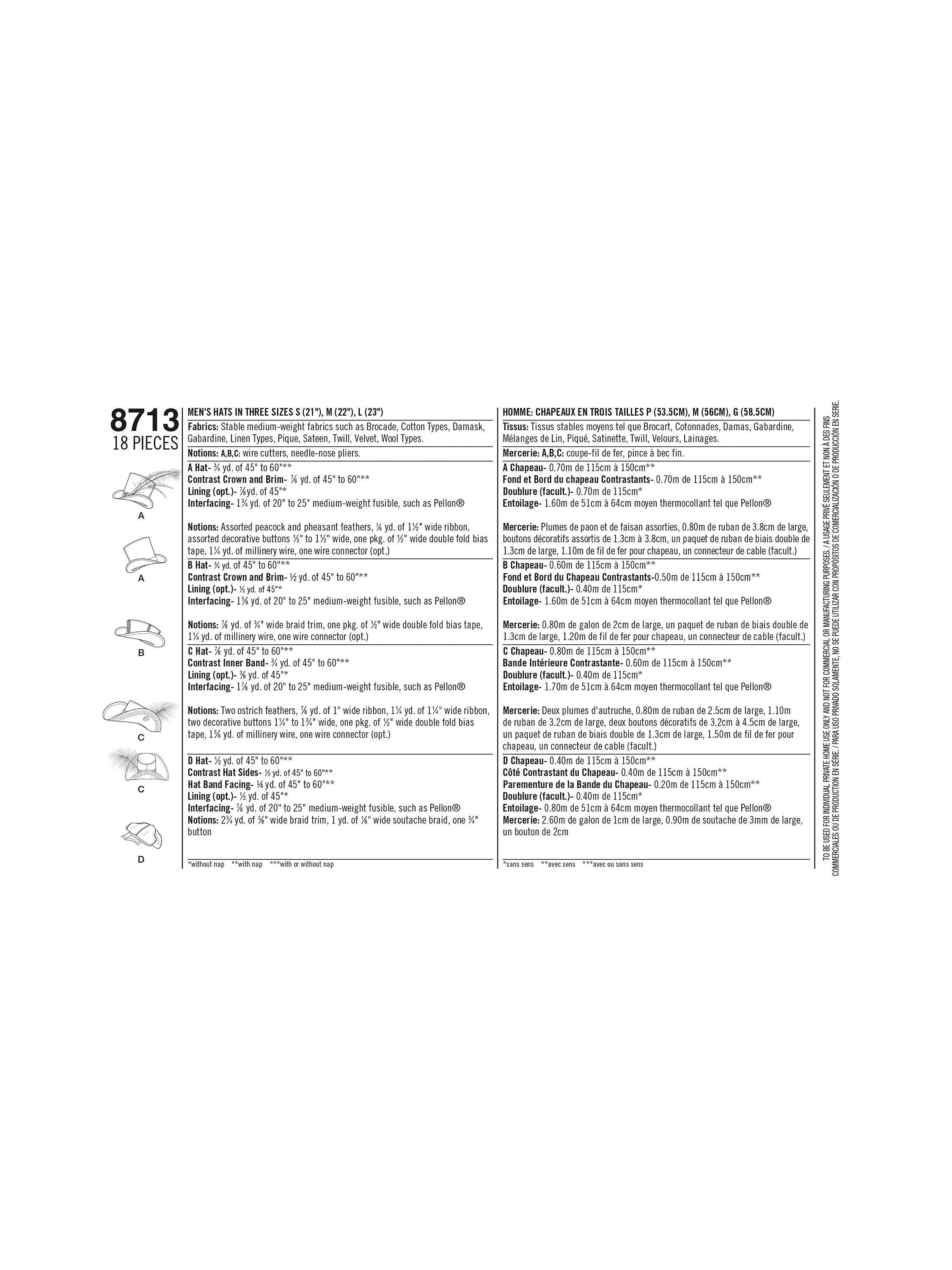 SimplicityMen's Costume Hats Sewing Pattern, S8713, A