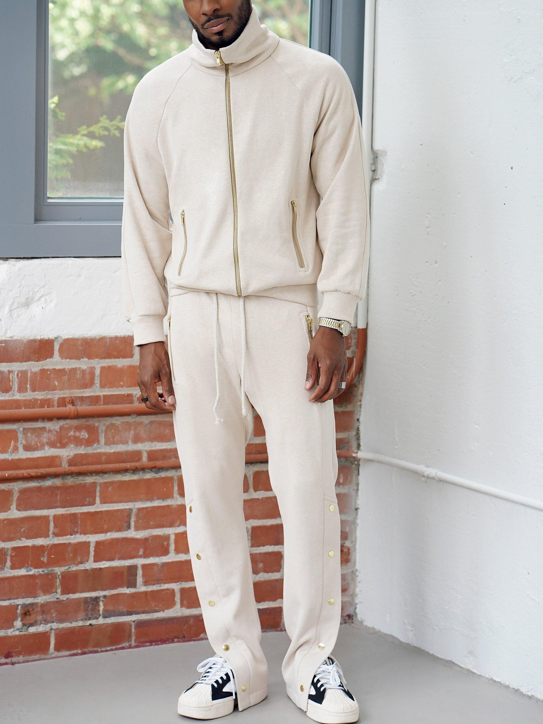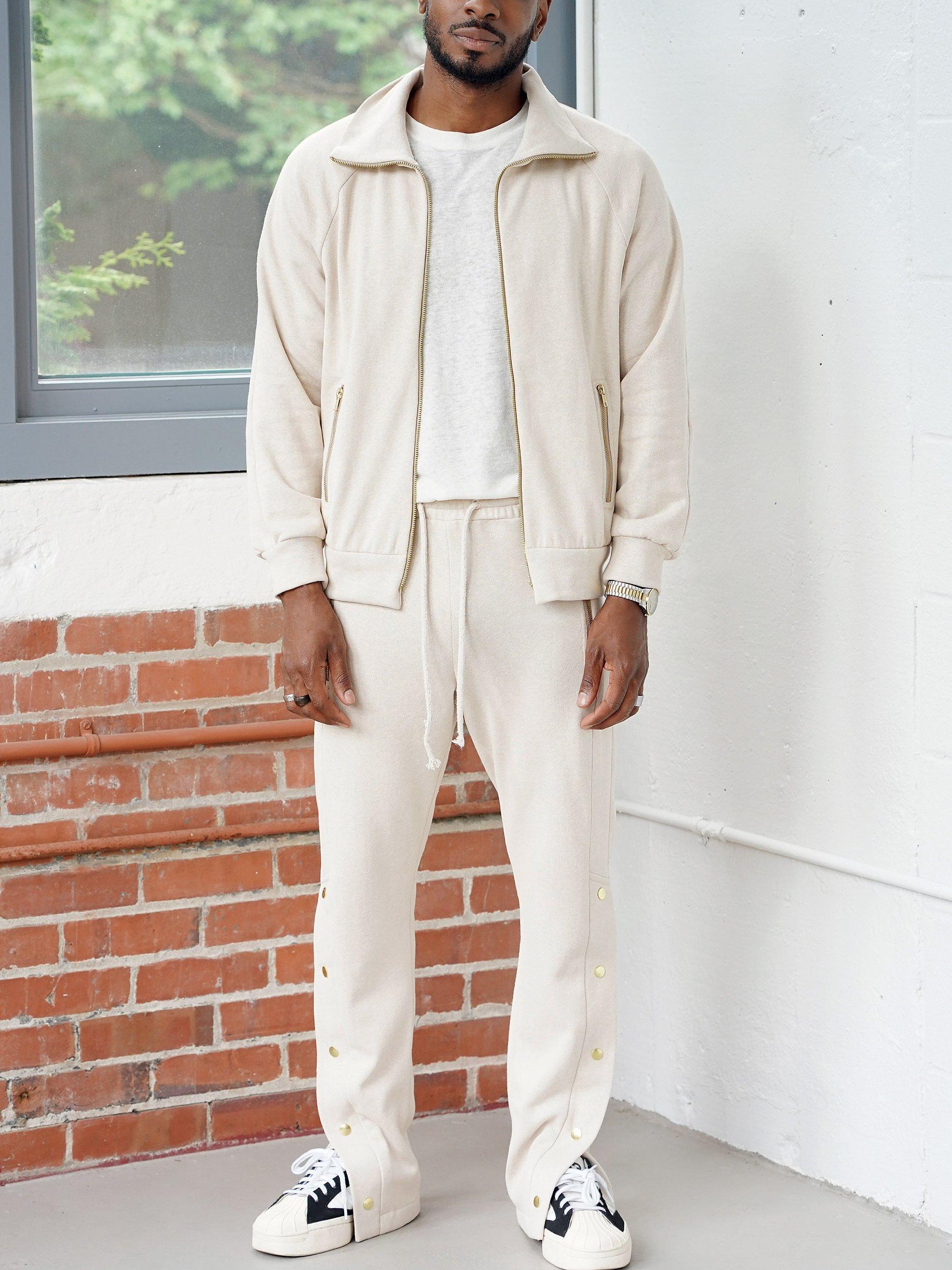 Jacket has a raglan sleeve with high stand neckline and front zipper opening. Pull-on pants have side panel and split leg below the knee with snap detail.
