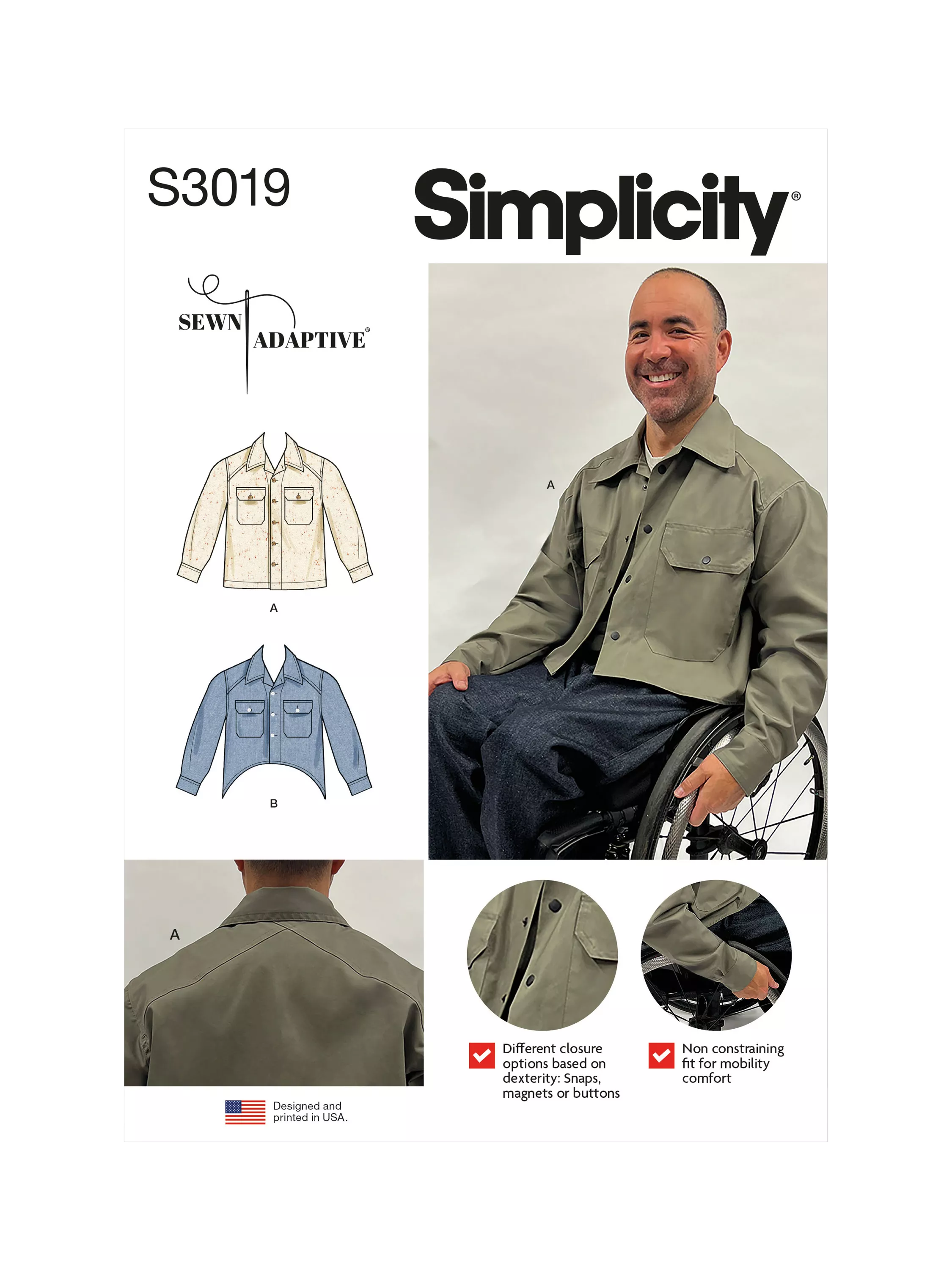 Roomy shacket has front and back yokes, front patch pockets with flaps, long sleeves with cuffs and front closure. Closure options for front, pockets and sleeve cuffs include buttons with buttonholes, snaps or magnets, depending on individual needs. Shaped and shortened front hem option is designed for wheelchair users, eliminating extra fabric while seated. See envelope for more information.