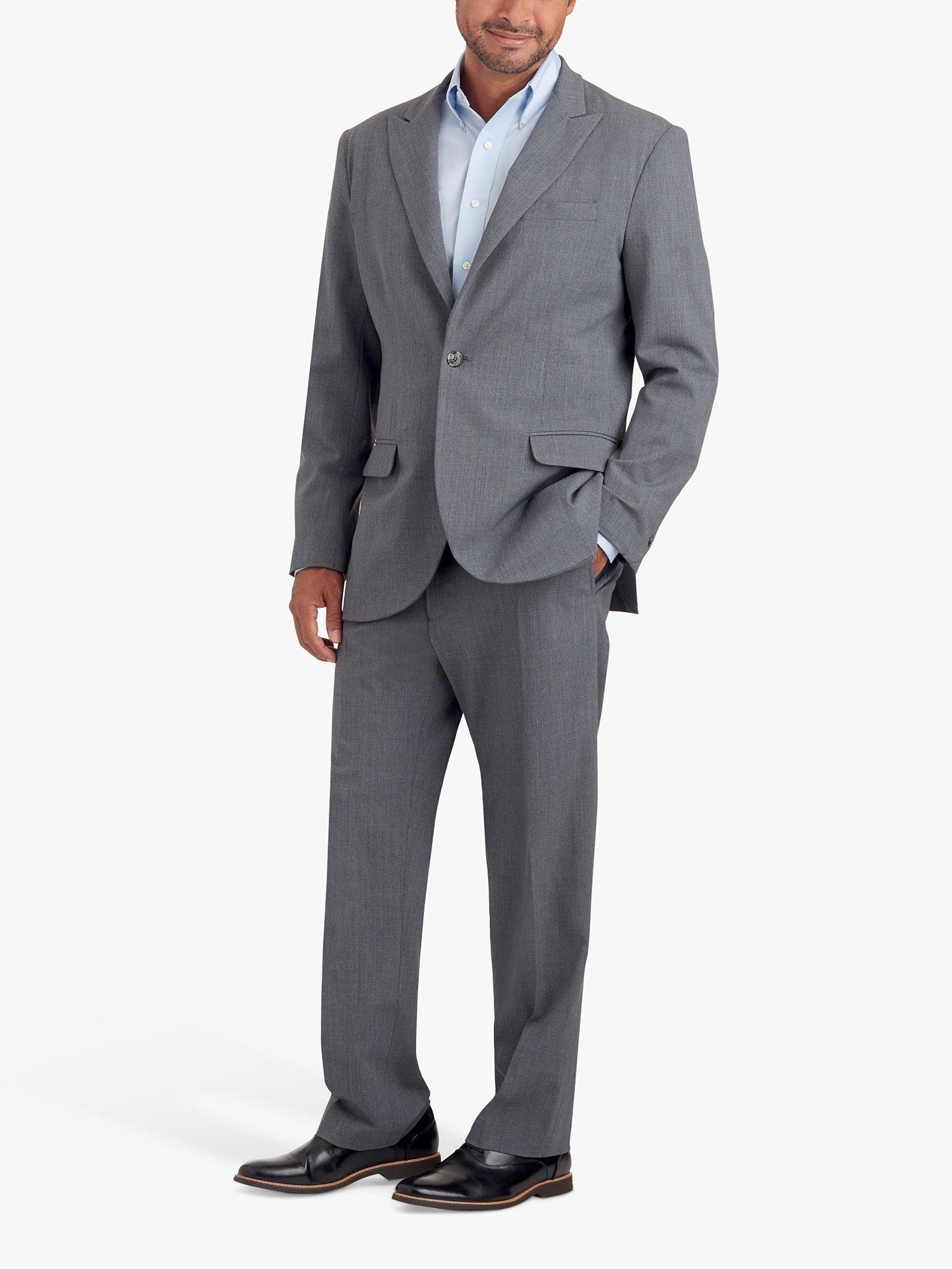 (mens 34/36/38/40/42") Fitted, unlined jacket has peaked lapels, two-piece sleeves, back vents; slightly tapered fitted pants have front & back pockets & buttoned waistband.