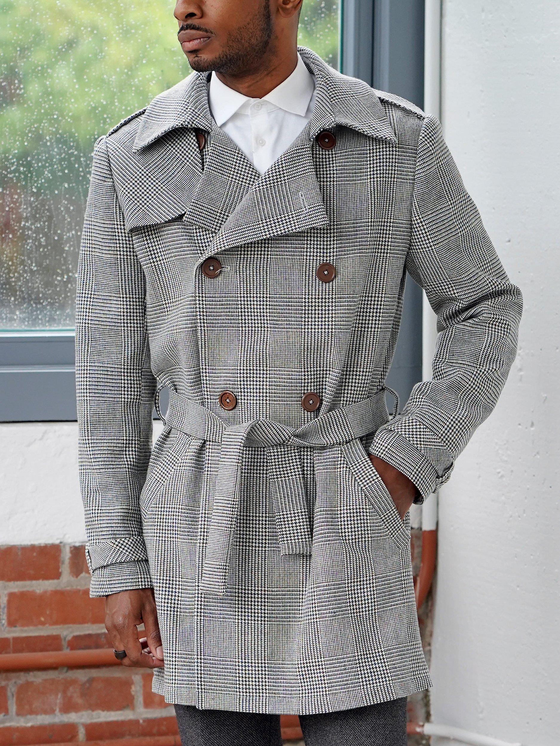 Double-breasted coat and jacket with storm flaps, epaulettes, cuff straps and self-belt, both of which use buckles.