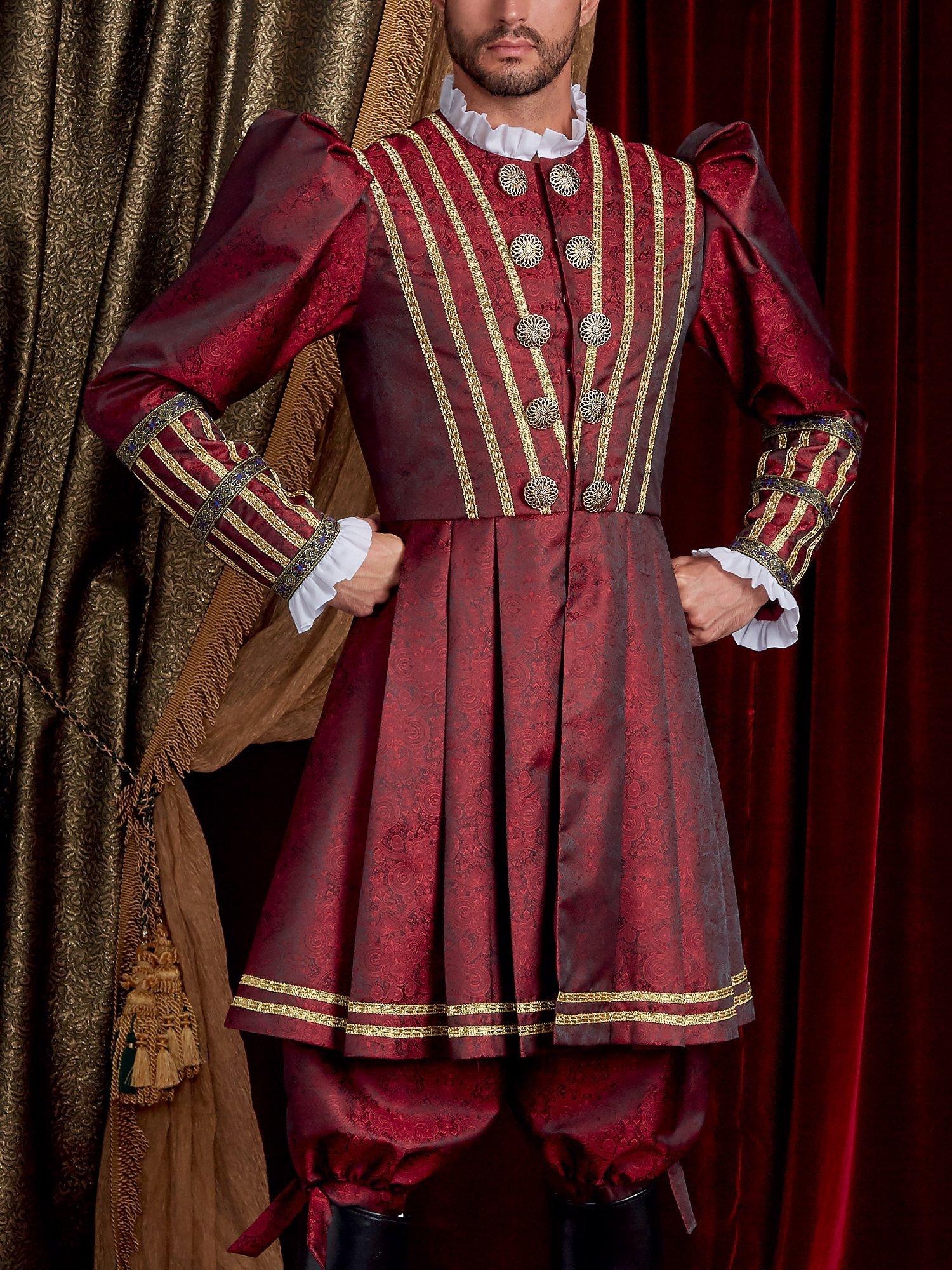 The opulence of the Tudor court comes to life with a richly trimmed doublet and knee-length pantaloons sewn in luxurious fabrics.
