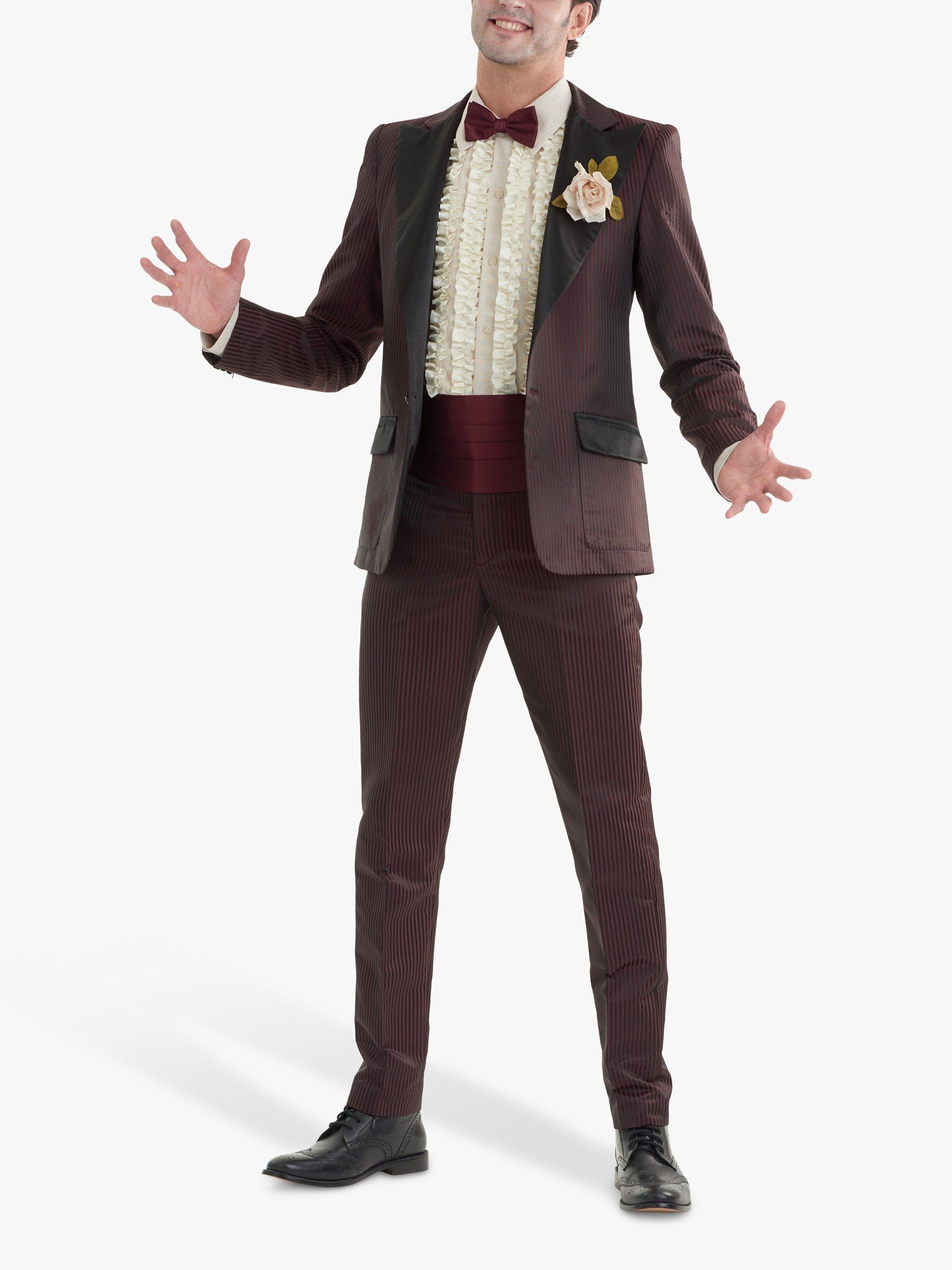 Ghoulishy dapper, unlined tuxedo costume with retro exaggerated lapels and ruffled shirt.