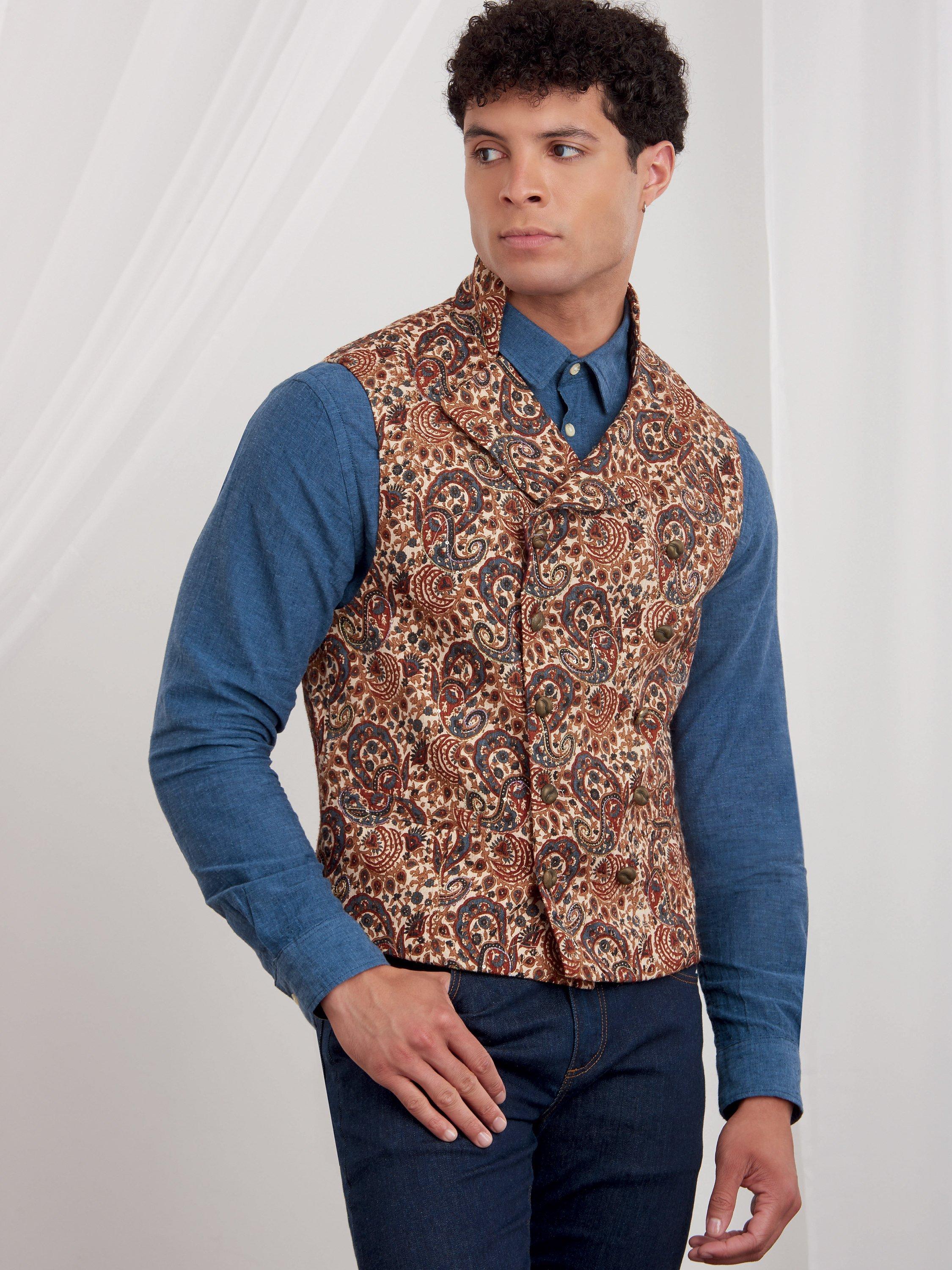 Men's double-breasted waistcoat has stand collar and lapel; single-breasted waistcoat has shaped contrast collar. Both views have collarless options; all have welt pockets, darts and back ties.
