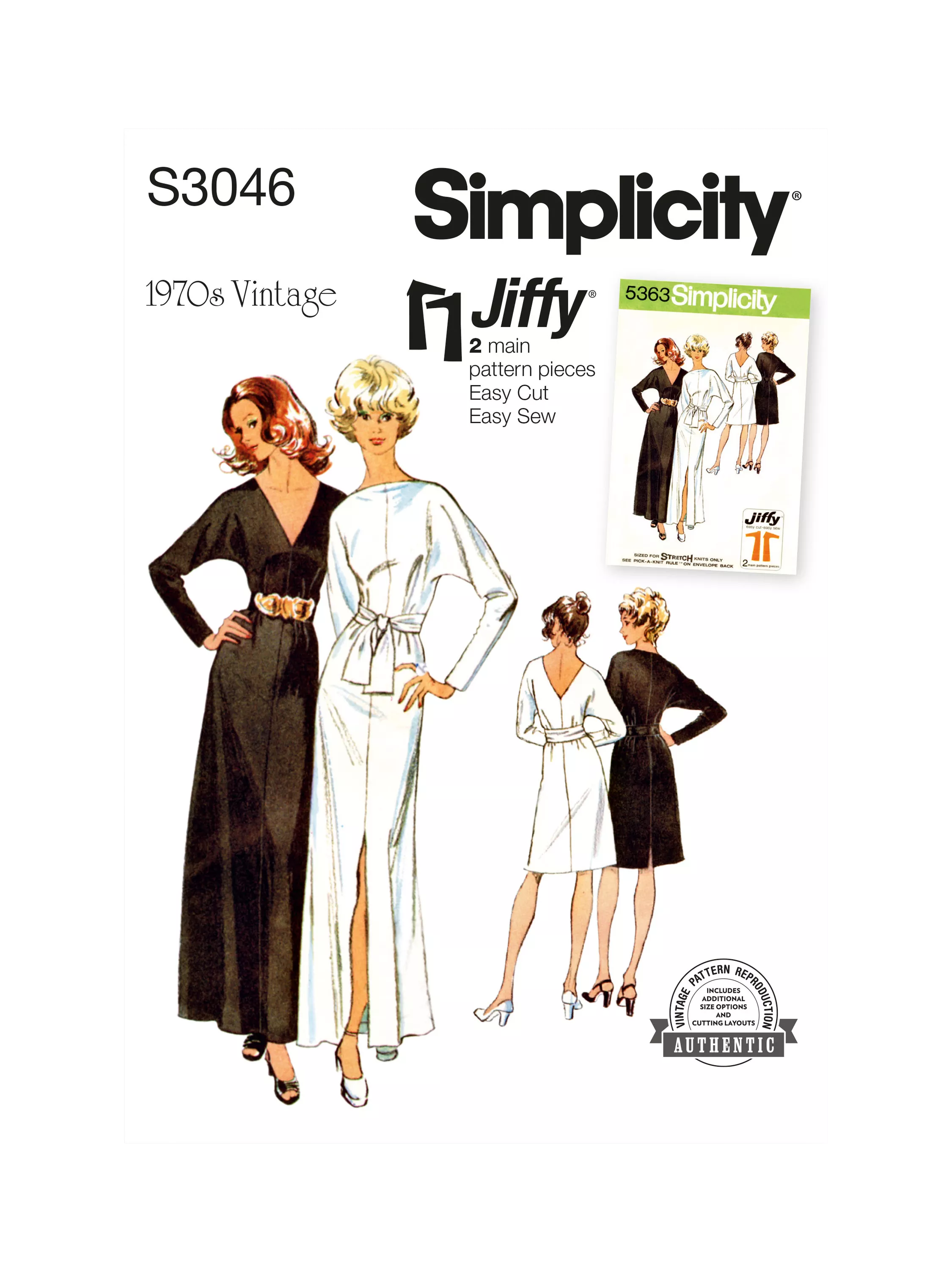 Vintage Simplicity 1970s Jiffy knit dress in two lengths and sash sewing pattern.The short or long dress with long kimono sleeves has high straight neckline and slit in front, V-shaped neckline in back and self-fabric sash or purchased belt slipped thru thread carriers. Dress may be worn with a V-shaped neckline in the front.