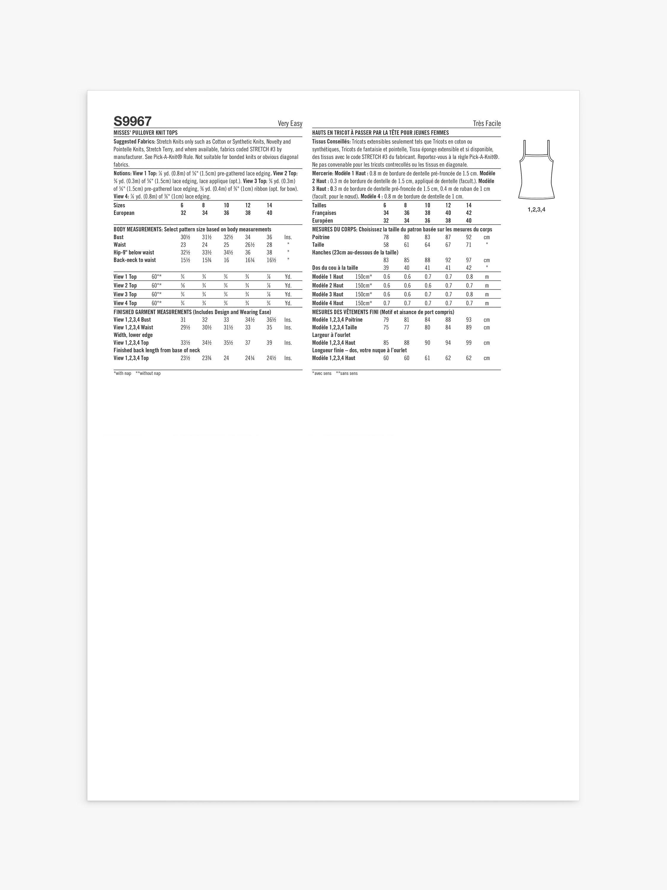 Top stitched tops have self-banded straps and lace trims. View 1 has self-ruffle flounce. View 2 has optional lace applique. View 3 has optional satin ribbon trim. View 4 has mock wrap front.