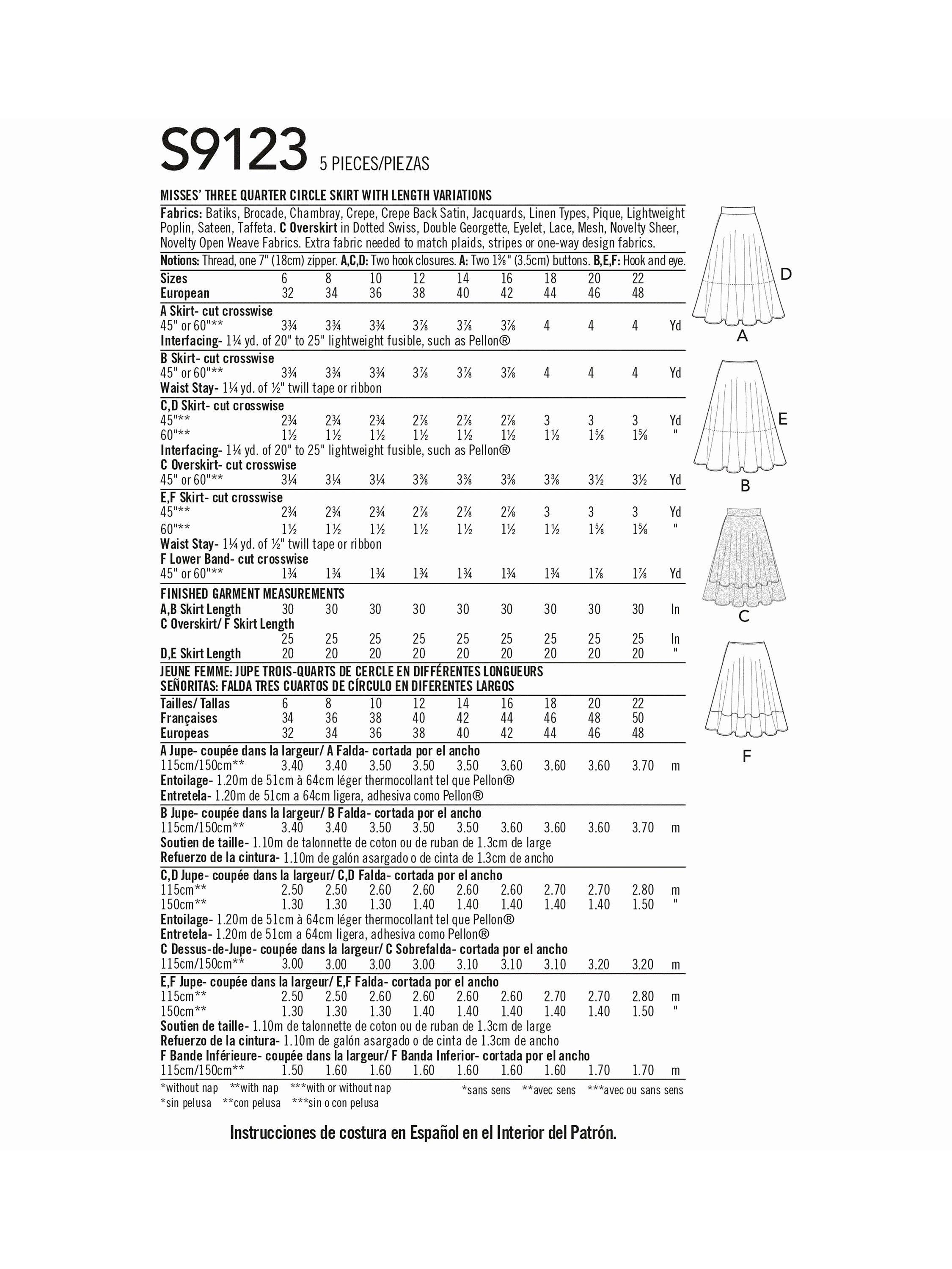 Misses' easy-to-sew three-quarter circle skirt can be 50cm or 76cm with or without waistband, 64cm with contrasting lower band and 50cm with stylish 64cm overskirt and waistband.