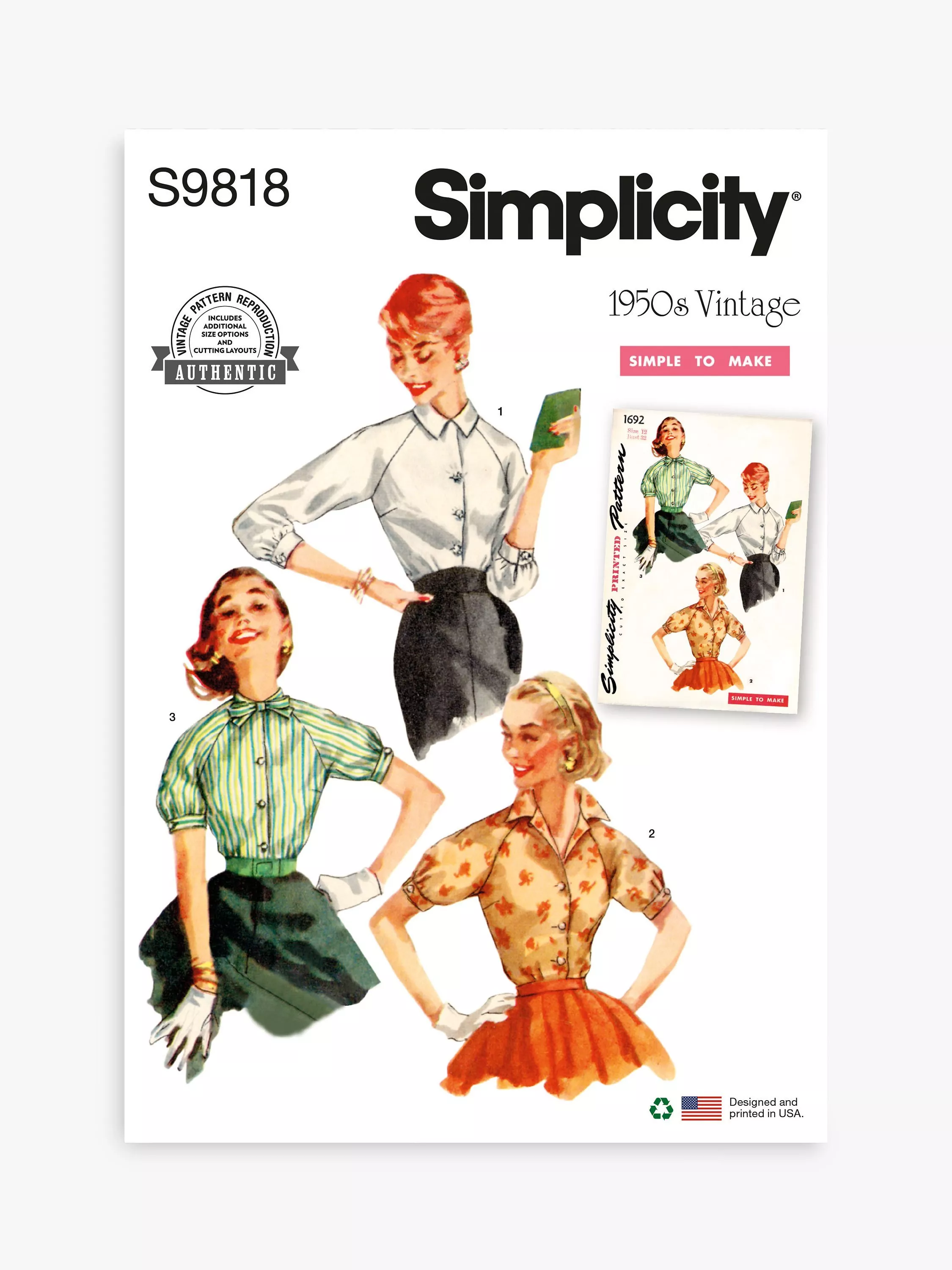 SimplicityMisses' 50s Vintage Blouses Sewing Pattern, S9818, H5
