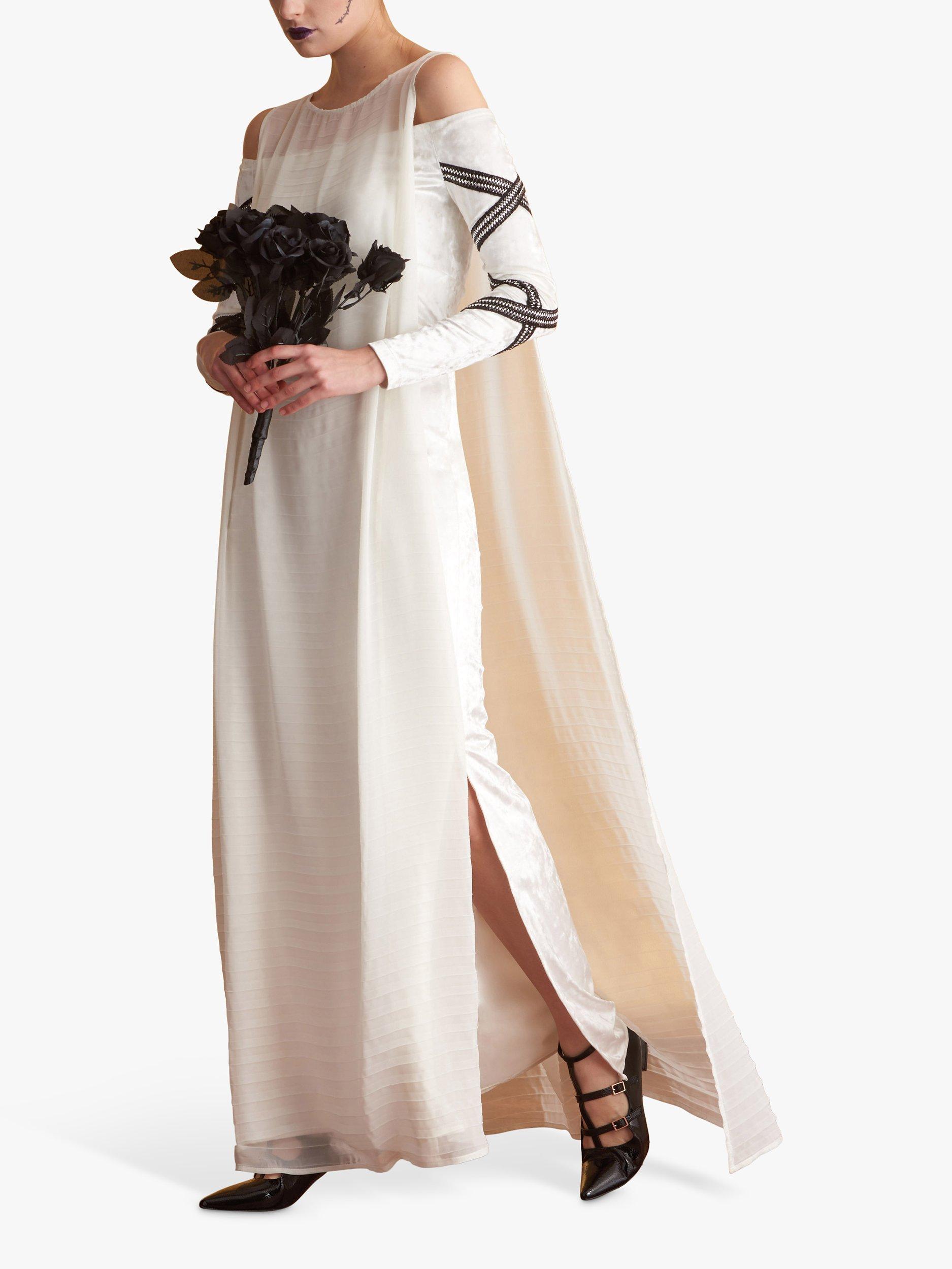 Trimmed long-sleeved gown is layered with a sheer tabard. Elbow length sleeved gown has trimmed sheer flounces and an elasticated collar.